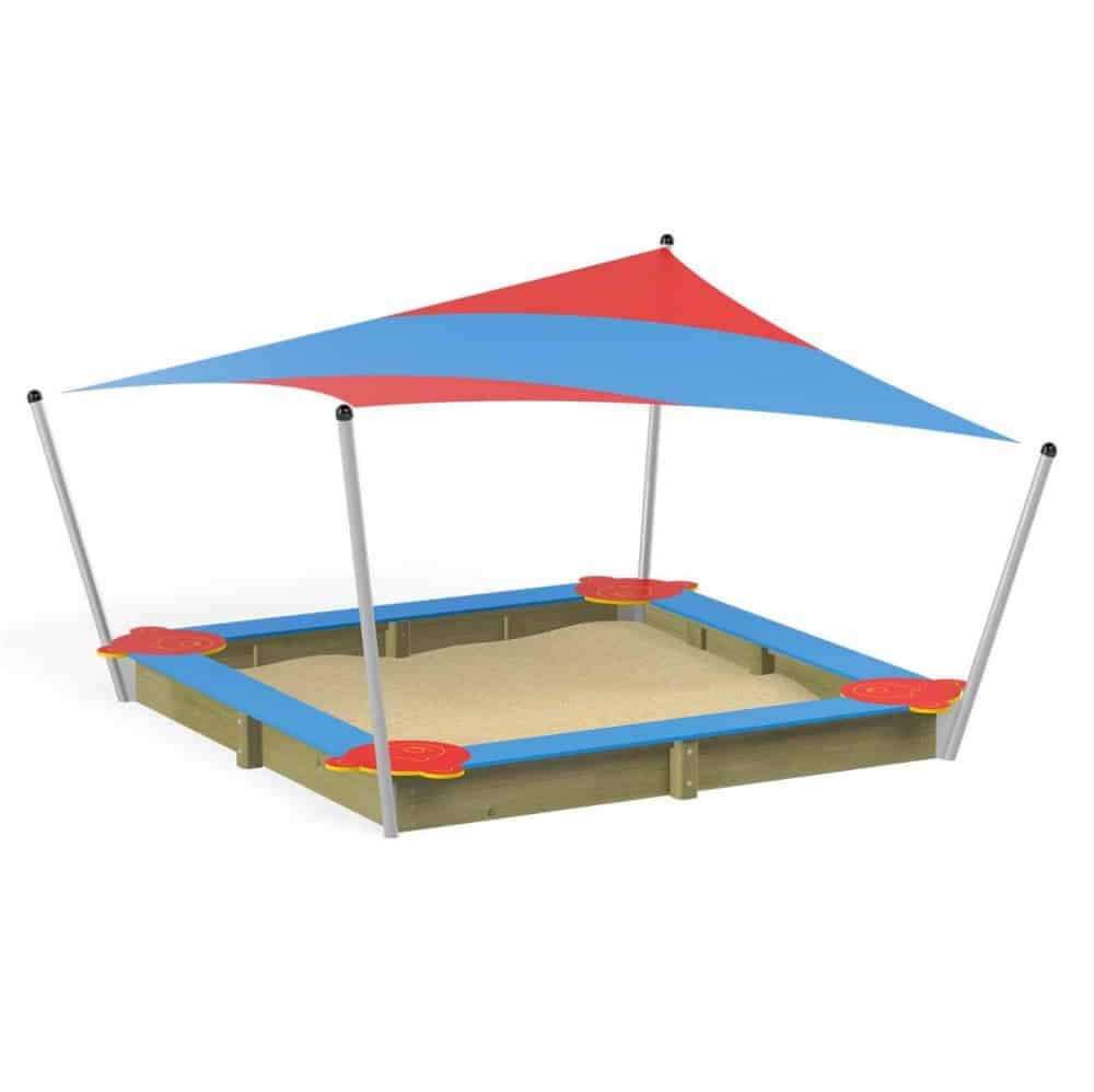 • Sandkasten mit Sitzfläche und Bärchen-Ecksitzen aus extrem robuster, wetterfester HDPE-Platte, ohne Boden. Das Sonnensegel schützt die kleinen Sandburgenbauer vor zuviel UV-Strahlung und dient nach dem Spielen als Abdeckung, um den Sand vor Verunreinigung zu bewahren.