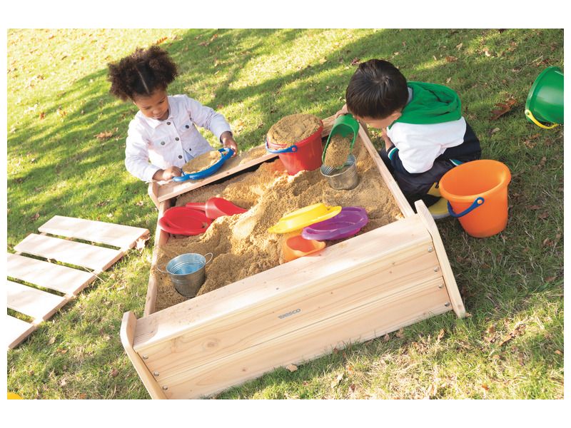 Dieser Sandkasten mit zwei Bänken lässt sich von den Kindern endlos benutzen.