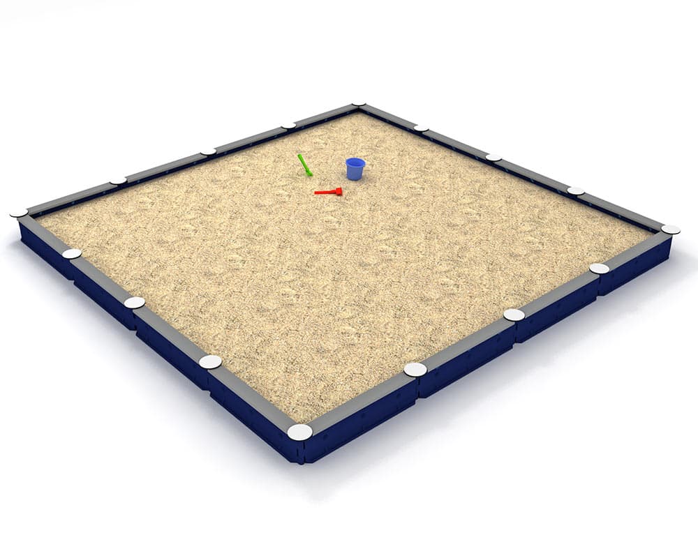 Sandkasten für viele Kinder, viele Sandkuchen, viele Burgen, Straßen, Tunnels … Alles, was die Erwachsenen so bauen, nur aus Sand und kleiner. Der Sandkasten mit 16 Seiten wird in den Farben: grau, blau, blau/grau, Marina und City angeboten.