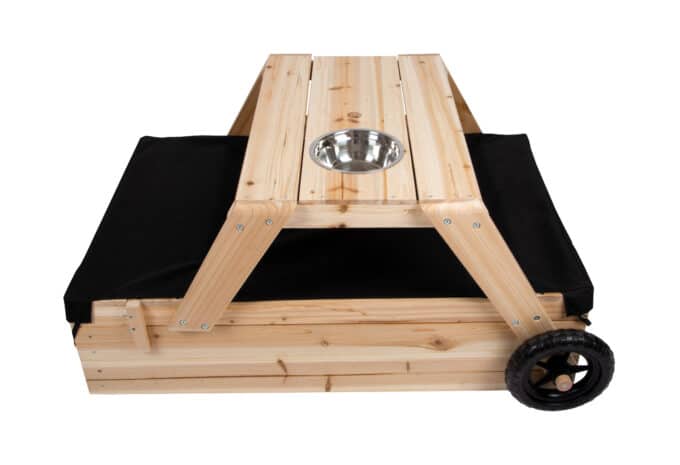 Platzsparender 3-in-1 Sandkasten für Balkon & Garten. Kombiniert Sandkiste, Sitzgruppe & Matschtisch. Mobil, mit Abdeckung. Für Kinder ab 24m+.