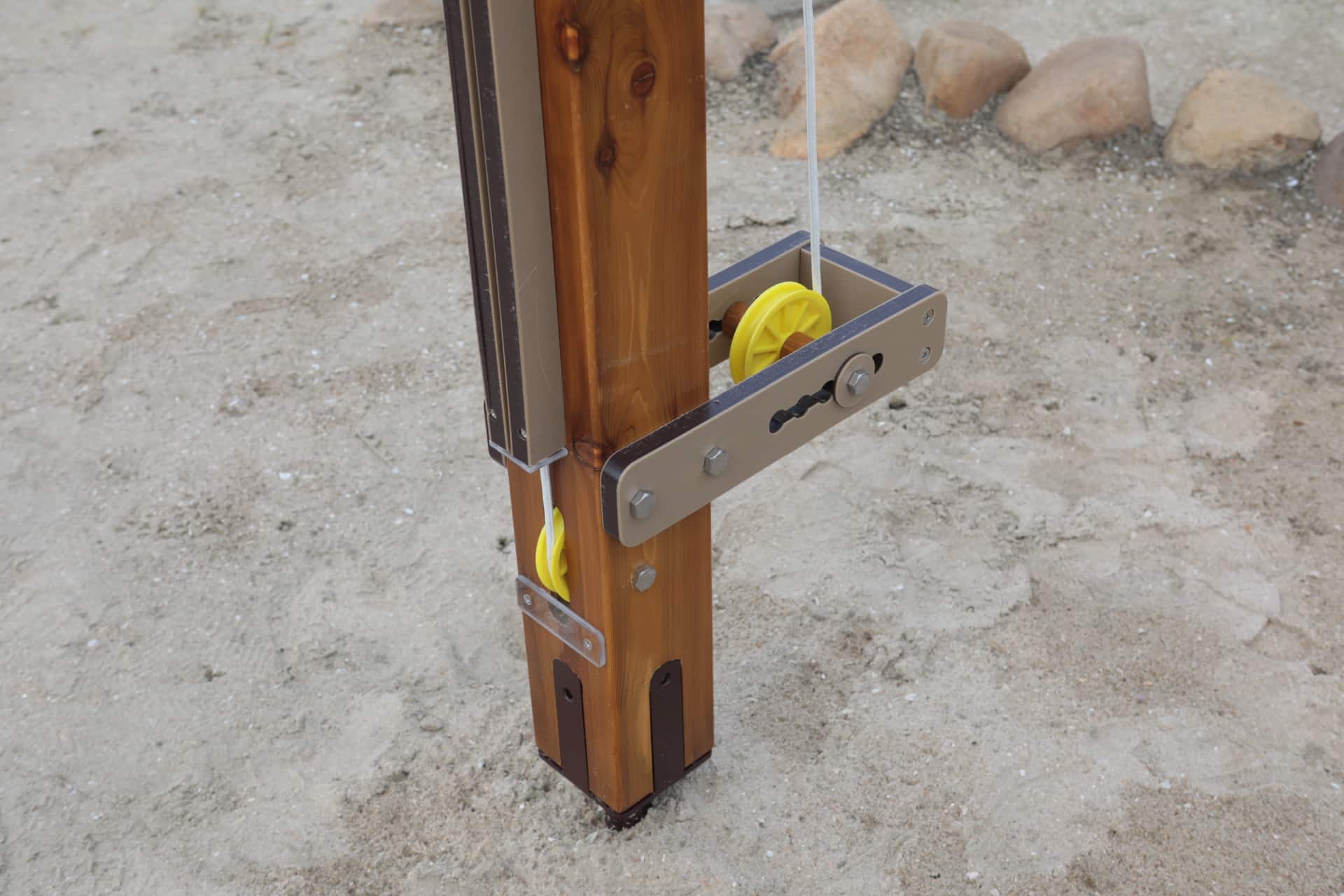 Mit dem Flaschenzug wird der Sand im Eimer nach oben befördert, wo er in den Transportwagen umgeladen wird. Die Kinder können mit Begeisterung beobachten, wie der Sand über die Schiene zur Abladestation transportiert wird, bereit für neue Abenteuer! Hier wartet bereits der LKW, der den Sand direkt zur Mischanlage bringt. Über einen praktischen Trichter wird der Sand zurück in den Eimer befördert, um den Kreislauf zu schließen und die Kinder immer wieder aufs Neue zum Spielen einzuladen. Diese dynamische Funktionsweise macht das Spiel nicht nur spannend, sondern lehrt die Kinder auch wertvolle Konzepte der Physik und Koordination.
