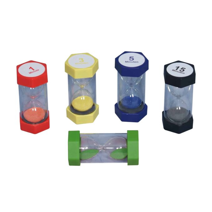 Das Sanduhren-Set besteht aus 5 verschiedenen Sanduhren, die in lebendigen Farben gestaltet sind. Jede sanduhr hat eine unterschiedliche Durchlaufzeit: 1, 3, 5, 10 und 15 Minuten. Das Beobachten des bunten Sandes, der durch die Uhr läuft, macht das abstrakte Konzept der Zeit greifbar. Die Kinder können sofort erkennen, wie schnell oder langsam die Zeit vergeht und verstehen, was in den jeweiligen Zeitabschnitten zu erledigen ist – sei es beim Spielen, Aufräumen oder Hausaufgaben machen.
