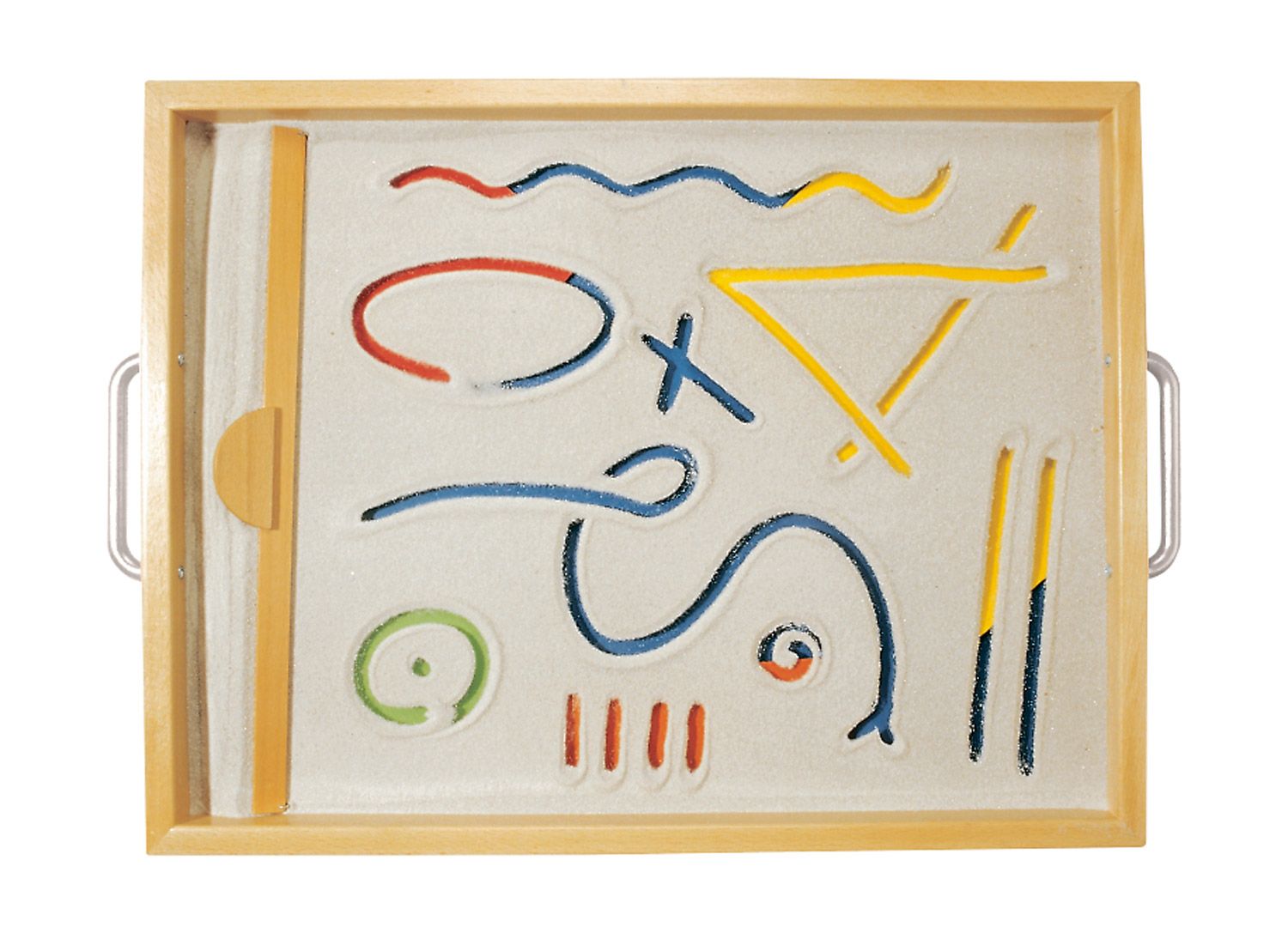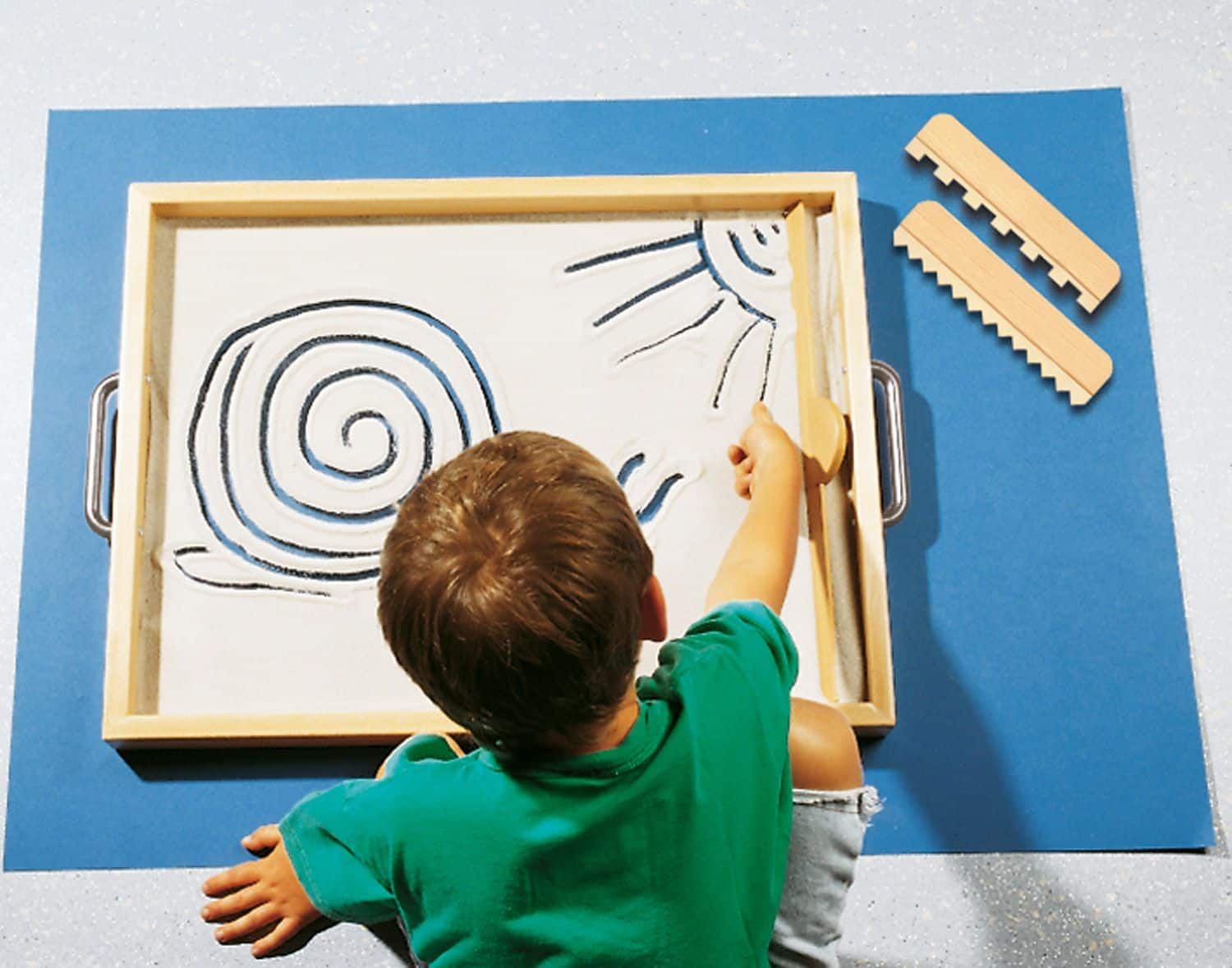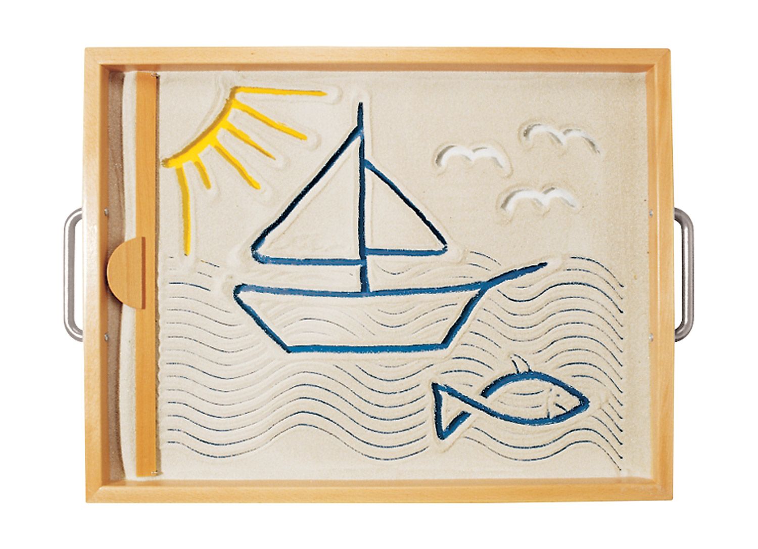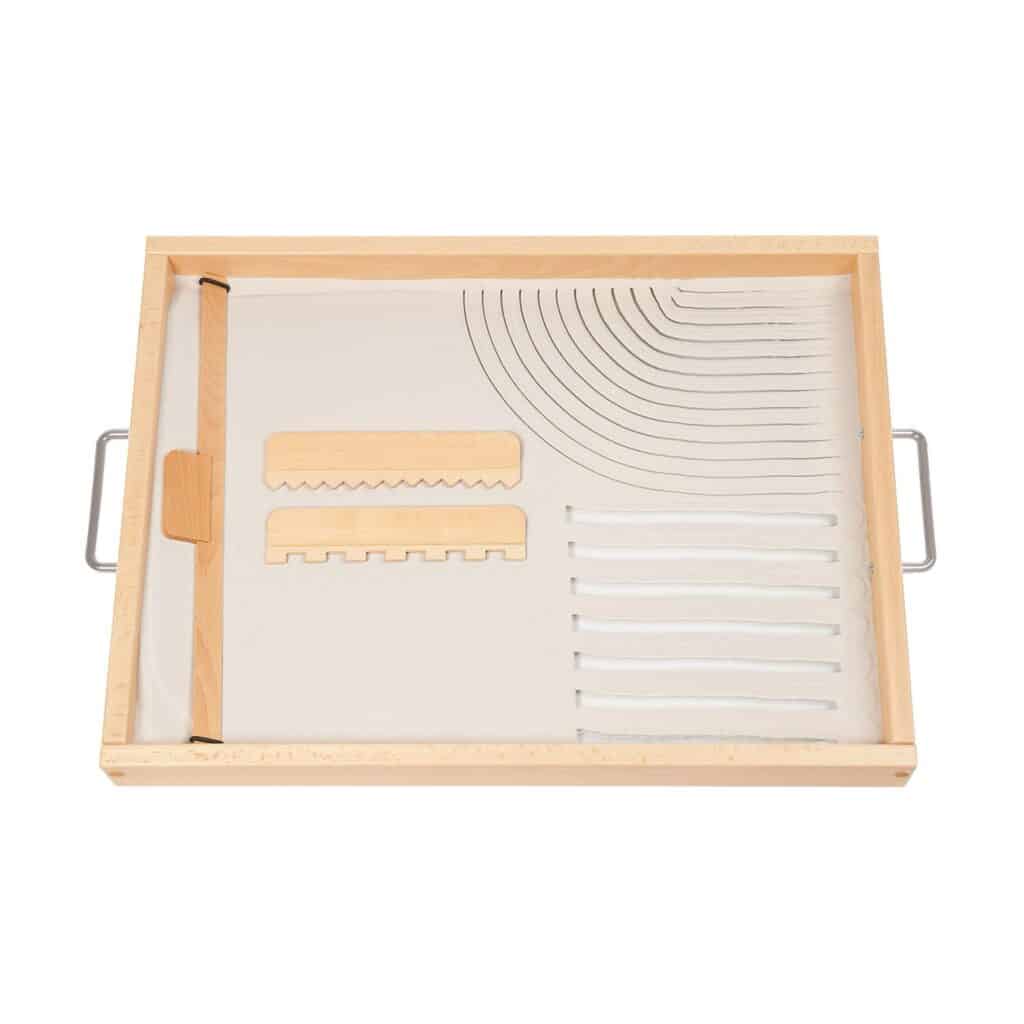 - Taktile Wahrnehmung fördern: Das Gefühl von feinem Sand, der zwischen den Fingern rieselt, ist nicht nur angenehm, sondern auch wichtig für die sensorische Entwicklung der Kinder. Sie können Löcher bohren, Linien und Figuren zeichnen oder kreative Muster legen, was die taktile Wahrnehmung sowie die Auge-Hand-Koordination entscheidend fördert.