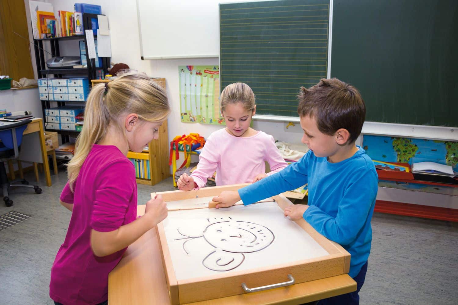 - Farbenfrohe Gestaltungsmöglichkeiten: Das Besondere an dieser Sandwanne ist der spezielle Glasboden, unter dem farbiges Papier oder selbstgestaltete Bilder platziert werden können. Wenn die Kinder mit ihren Fingern, Rechen oder Stöcken im Sand zeichnen, werden die bunten Untergründe sichtbar, wodurch wunderschöne Muster und Bilder entstehen. Diese kreativen Kreationen können jederzeit durch den Sandschieber gelöscht und neu gestaltet werden.