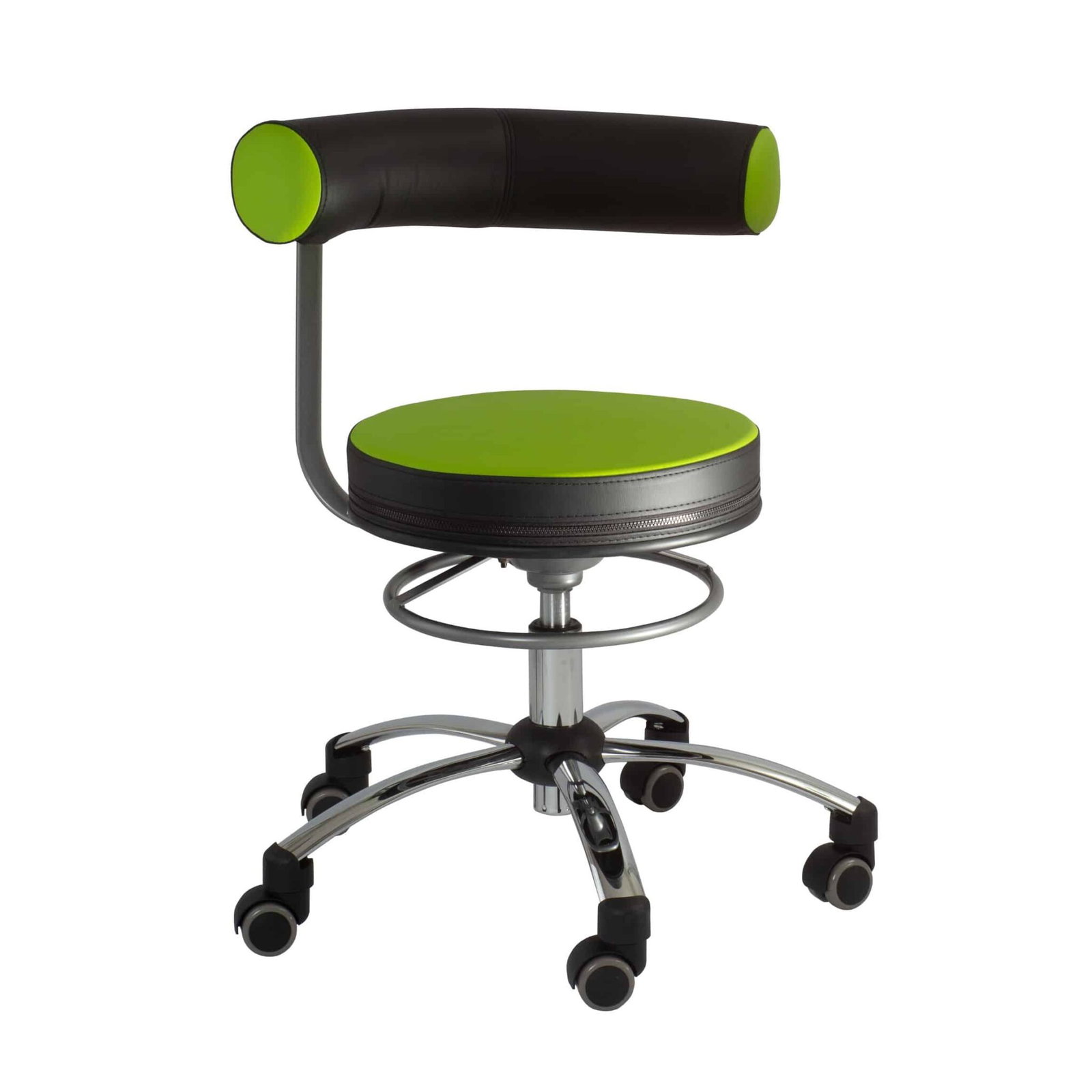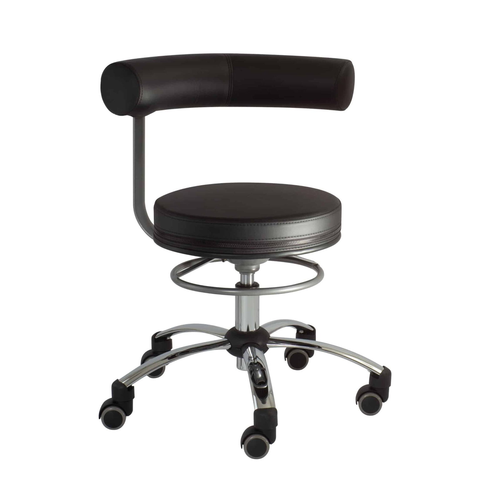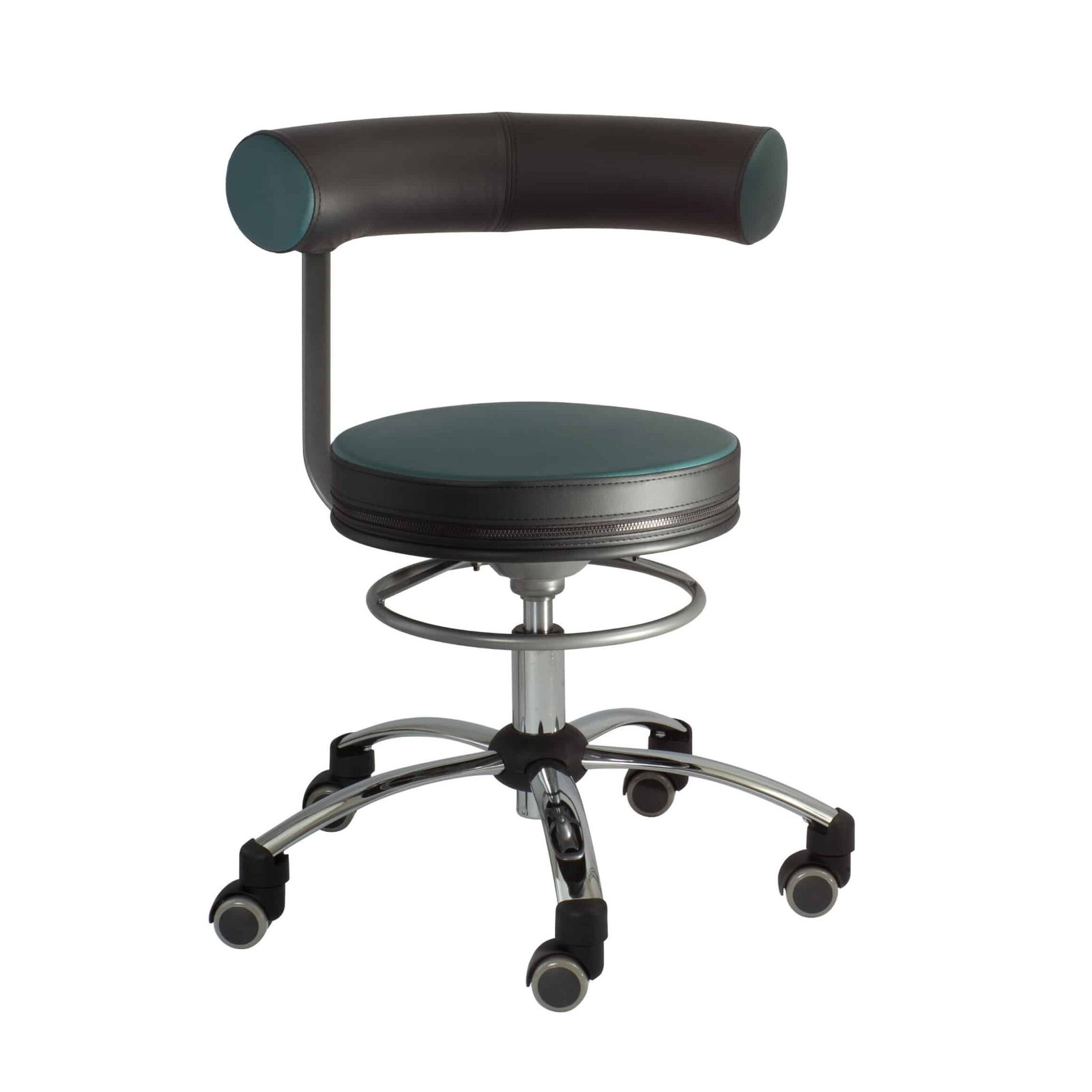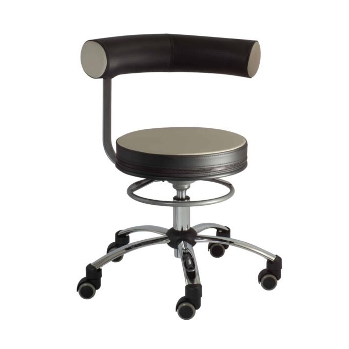 - fünf Chromfüße mit Hartbodenrollen (und Rollstopp), kleiner als üblich, machen mobil und ermöglichen auch das Rollen unter Tische mit geringer Höhe