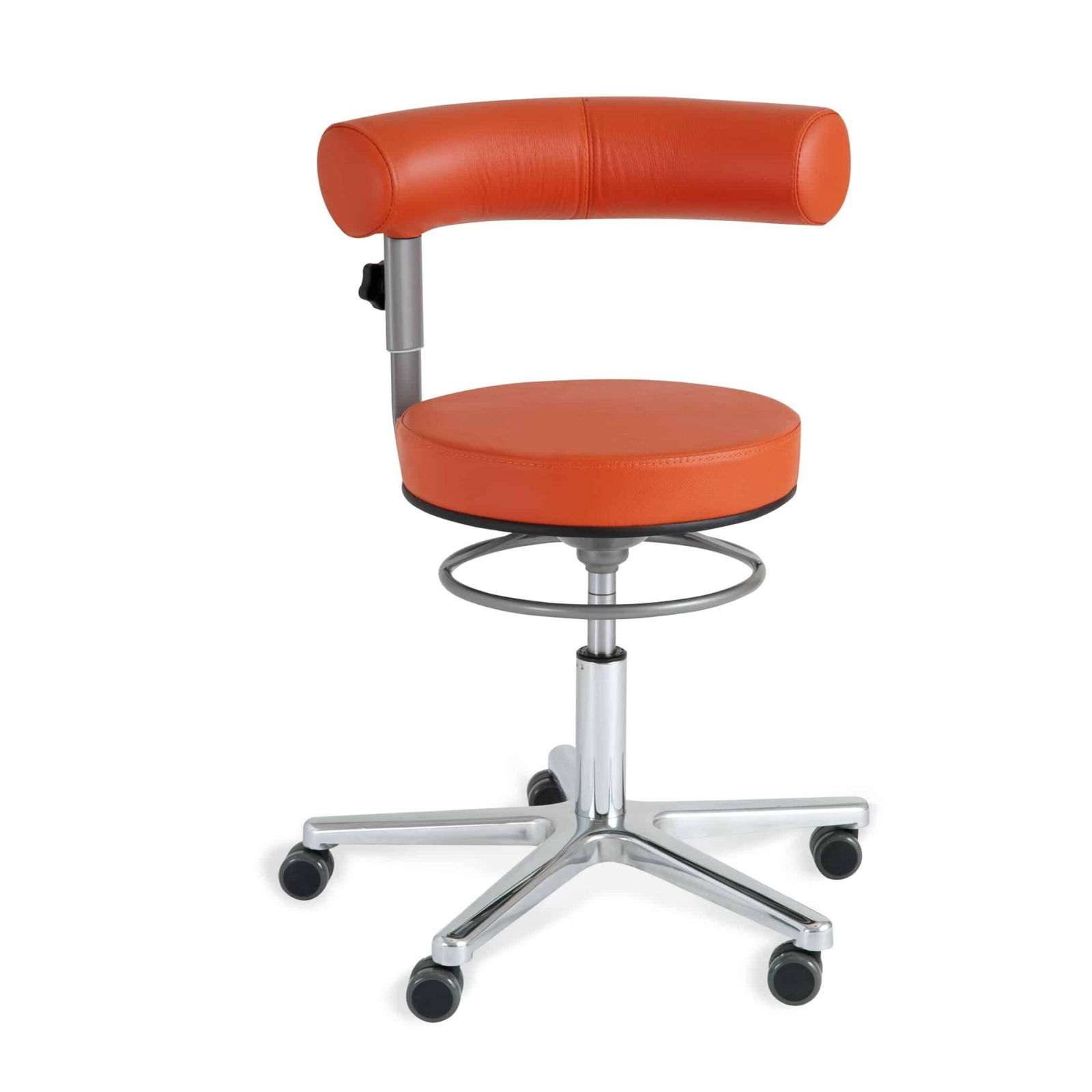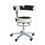 • fünf Chromfüße mit Hartbodenrollen (und Rollstopp), kleiner als üblich, machen mobil und ermöglichen auch das Rollen unter Tische mit geringer Höhe