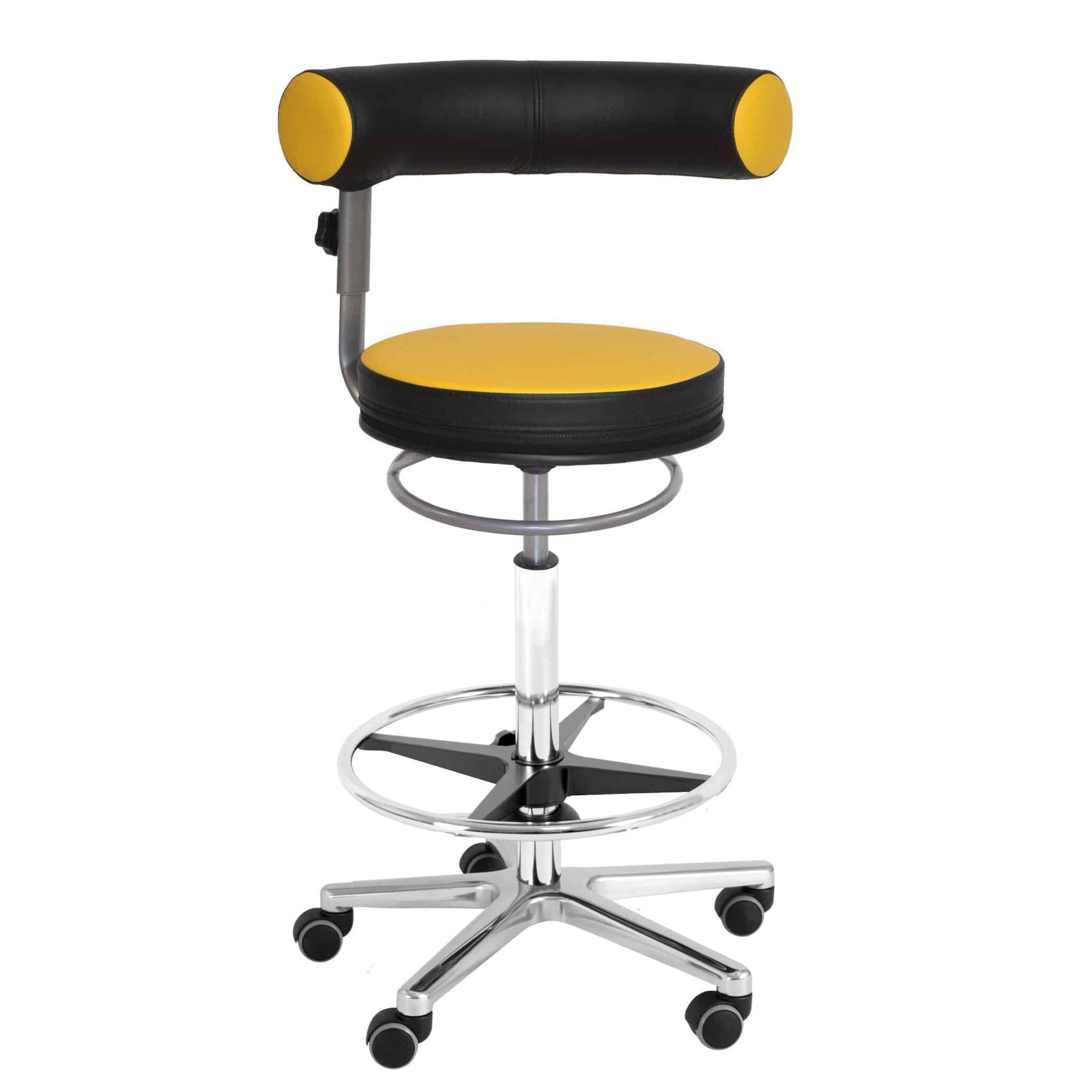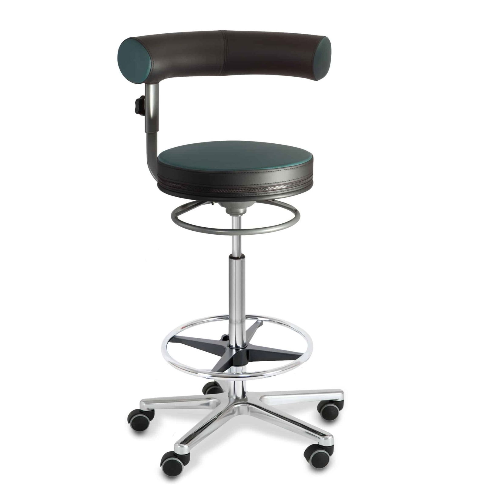 - fünf Chromfüße mit Hartbodenrollen (und Rollstopp), kleiner als üblich, machen mobil und ermöglichen auch das Rollen unter Tische mit geringer Höhe