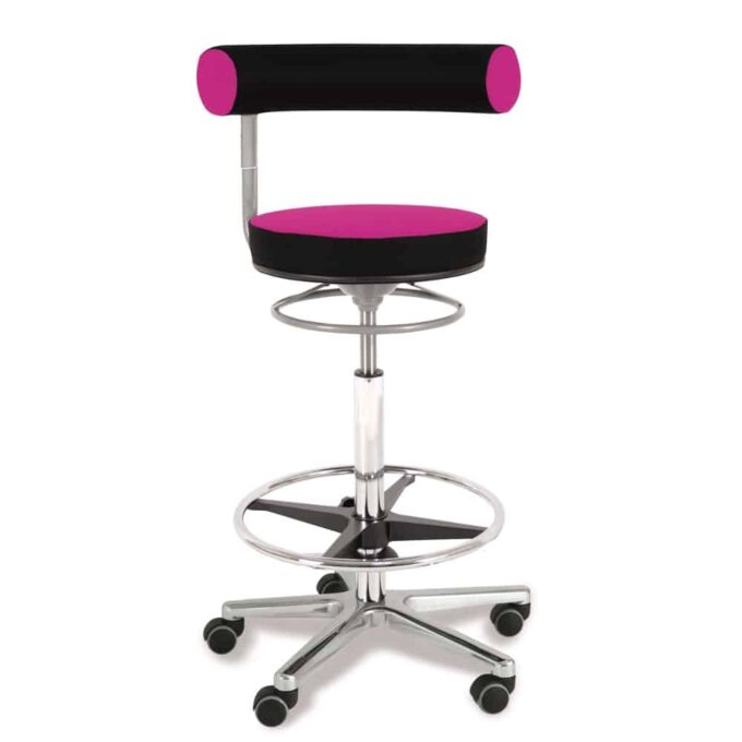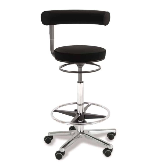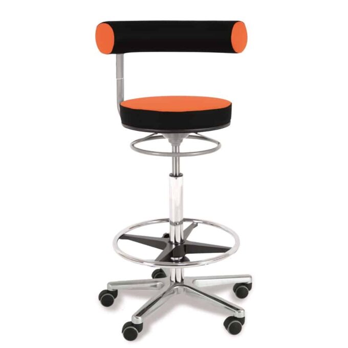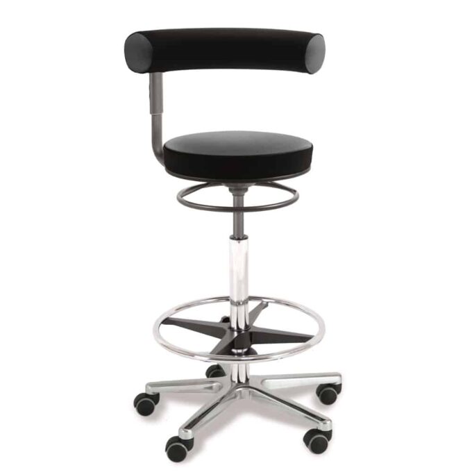 - fünf Chromfüße mit Hartbodenrollen (und Rollstopp), kleiner als üblich, machen mobil und ermöglichen auch das Rollen unter Tische mit geringer Höhe