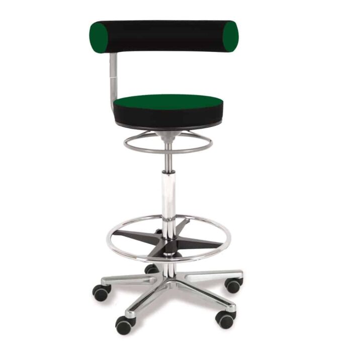 - die aus dem Sitzen heraus vollkommen schwenkbare gepolsterte Lehne (um 360º), lässt sich in jede nur denkbare Position drehen: seitlich oder zum Aufstützen der Arme vorn und natürlich nach hinten zur Stützung des Rückens
