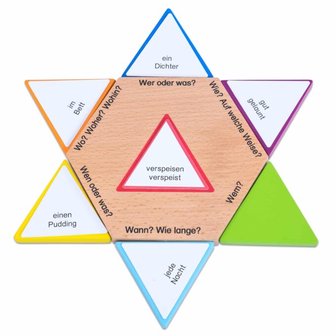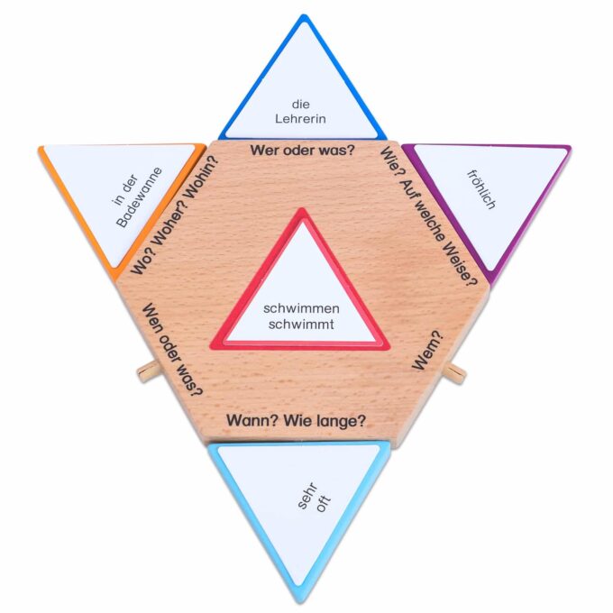 Mit den Satzstern-Karten erwerben die Kinder die Fähigkeit, Sätze aktiv zu konstruieren. Das Konzept dreht sich um den Satzstern, der als dynamisches Satzzentrum fungiert und das Verb in den Mittelpunkt stellt. An den flexibel ansteckbaren Sternspitzen werden Subjekt- und Objektergänzungen sowie Angaben angebracht. Auf diese Weise lernen die Kinder nicht nur die verschiedenen Satzteile zu erkennen, sondern sie erfahren auch, wie man diese schnell und effektiv einsetzen kann.