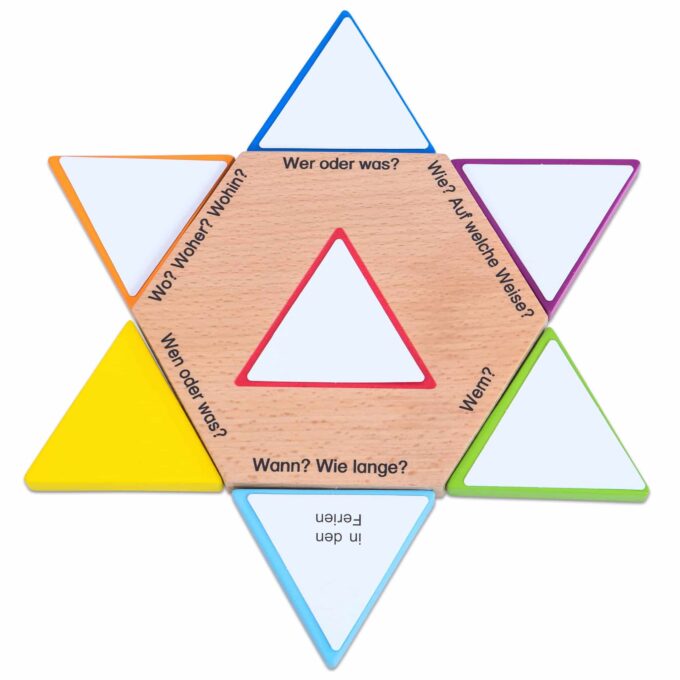 Durch diese vielseitige Gestaltung können Lehrkräfte und Eltern die Karten flexibel im Unterricht oder beim Lernen zu Hause einsetzen. Da die farbliche Zuordnung von Dativ und Akkusativ in verschiedenen Bundesländern unterschiedlich anerkannt ist, können die Sternspitzen den jeweiligen Farben selbst zugeordnet werden. Dadurch bleibt das Set vielseitig und anpassbar.