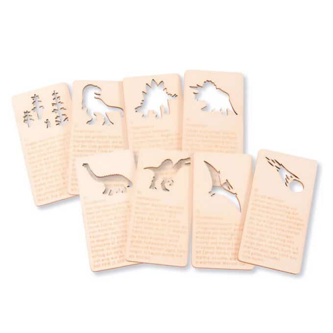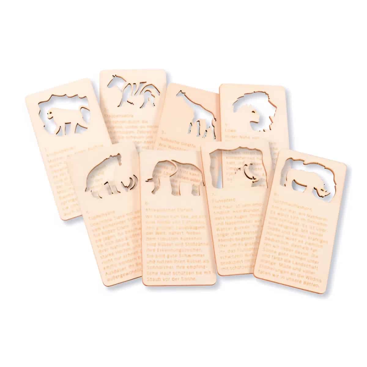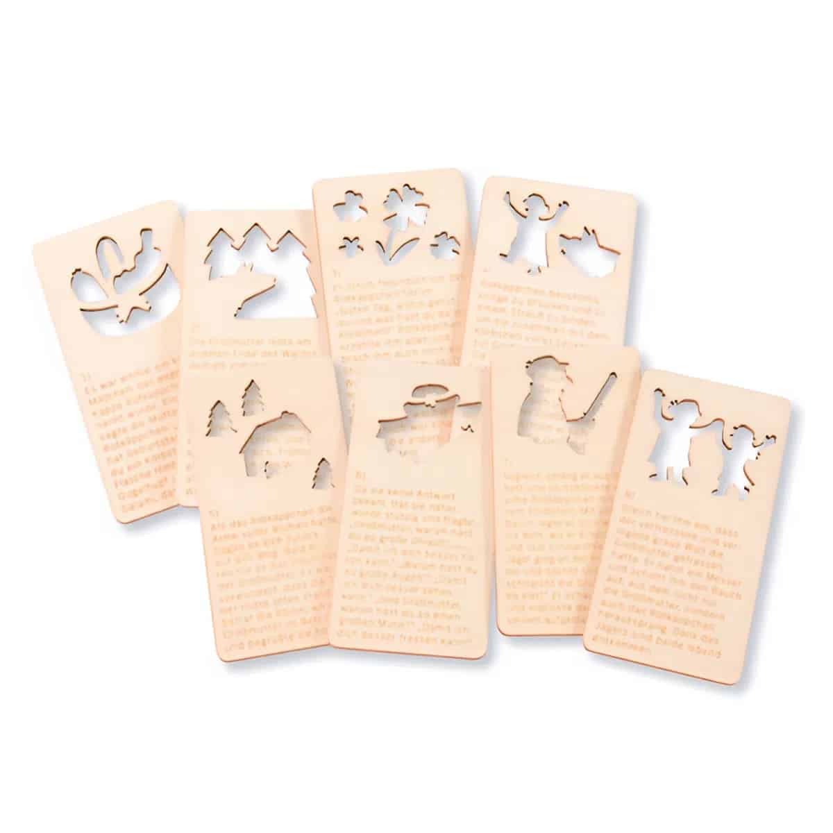 - Inhalt pro Set: 8 nummerierte Holzkarten mit ausgesparten Motiven und Story-Text