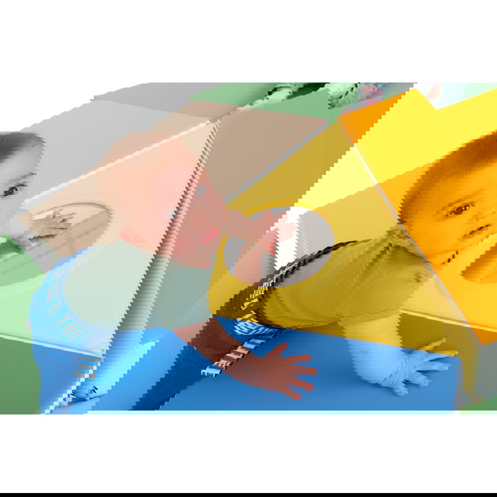 Das durchdachte Design der Insel bietet den Kindern drei völlig unterschiedliche Aufgänge: Eine sanfte Rampe, eine kindgerechte Treppe und eine wellenartige Struktur fordern die Kleinen auf verschiedene Weise heraus. Beim Krabbeln und Klettern lernen sie ihren eigenen Körper besser kennen und bauen wertvolles Selbstvertrauen auf. Das absolute Highlight wartet jedoch oben auf dem Podest: Ein sicher integrierter Acrylspiegel sorgt für eine riesige Überraschung, wenn die Kinder plötzlich ihr eigenes Spiegelbild entdecken. Dieses clevere Element fördert die visuelle Selbstwahrnehmung und macht das gemeinsame Spielen noch viel lustiger.