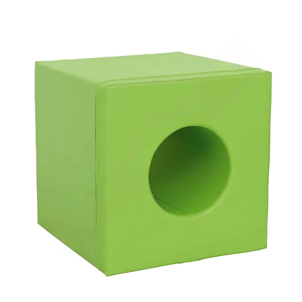 Der Kern aus festem Schaumstoff bietet Stabilität für Kletterversuche, ist aber gleichzeitig weich genug, um Stürze und Sprünge sicher abzufedern. Das robuste Kunstleder ist angenehm auf der Haut und frei von harten Kanten. So bietet der Würfel einen sicheren Rahmen für aktives Toben und kann gleichzeitig als gemütlicher Rückzugsort zum Verstecken oder Ausruhen dienen.