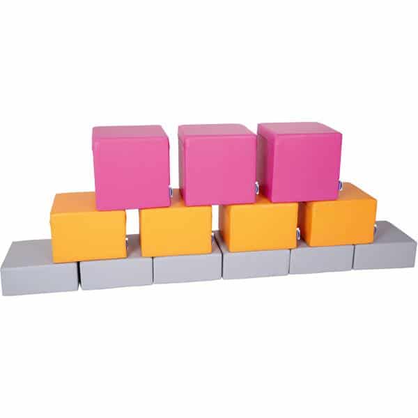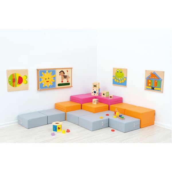 Verschiedenfarbige Schaumstoff-Sitze mit einer Grundfläche von je 35 x 35 cm und unterschiedlichen Höhen ermöglichen die Schaffung eines kleinen Erholungsplatzes. Herrliche Konstruktionsspiele oder der Bau einer Hindernisbahn fordern die Kinder auf vielen Entwicklungsebenen.