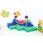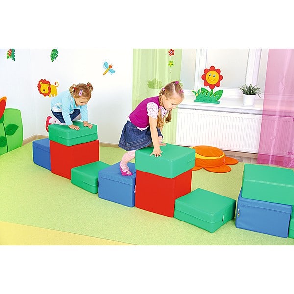 Verschiedenfarbige Schaumstoff-Sitze mit einer Grundfläche von je 35 x 35 cm und unterschiedlichen Höhen ermöglichen die Schaffung eines kleinen Erholungsplatzes. Herrliche Konstruktionsspiele oder der Bau einer Hindernisbahn fordern die Kinder auf vielen Entwicklungsebenen.