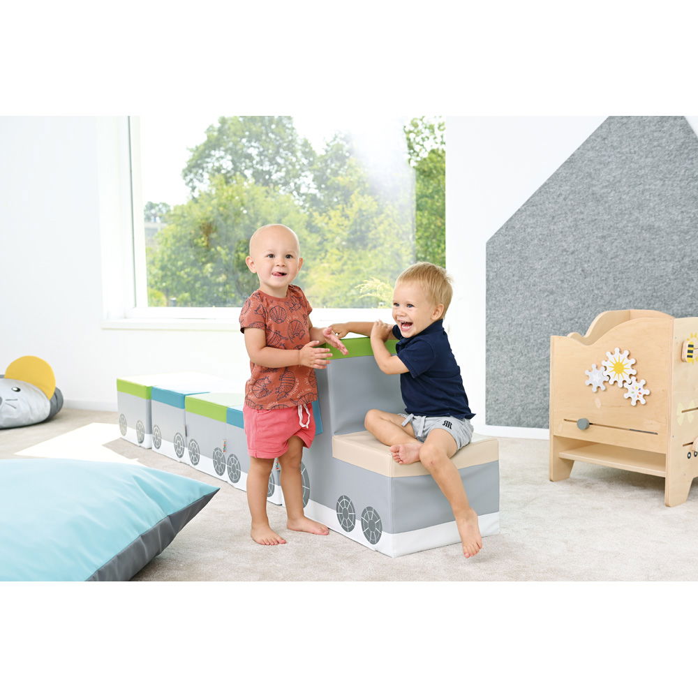 Ob als zusammenhängender Zug für Rollenspiele, als einzeln im Raum verteilte Sitzgelegenheiten oder als Hindernisse in einem Bewegungsparcours – die Elemente passen sich jeder Situation an. - Leicht zu reinigen und hygienisch