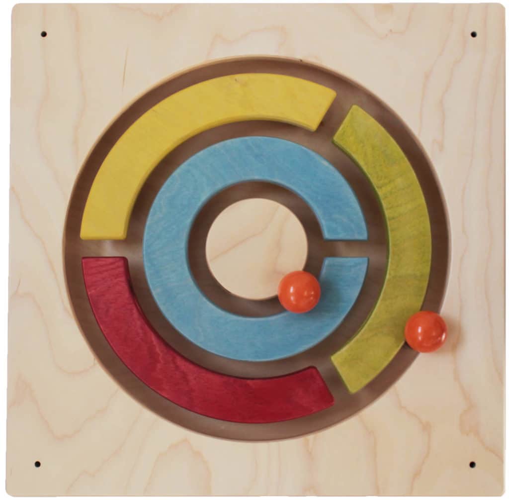 Der Irrgarten besteht aus drei Kreisen die unterbrochen sind. Mit zwei Holzkugeln wird der Irrgarten durchfahren, so dass die Kugel entweder im Innenkreis landet oder im Außenkreis ist. Das Schiebespiel wird mit vier Schrauben an der Wand befestigt. Das Wandspiel hat durch die gute Farbzusammenstellung auch eine dekorative Wirkung.