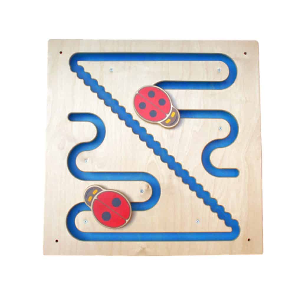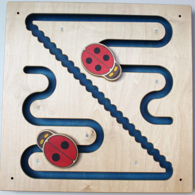 Das quadratische Schiebespiel hat eine diagonale wellenförmige Ein-fräsung, auf der handliche Marienkäfer hinauf und hinunter krabbeln können. Das verursacht auch ein lustiges Geräusch. Es wird mit vier Schrauben an der Wand befestigt.