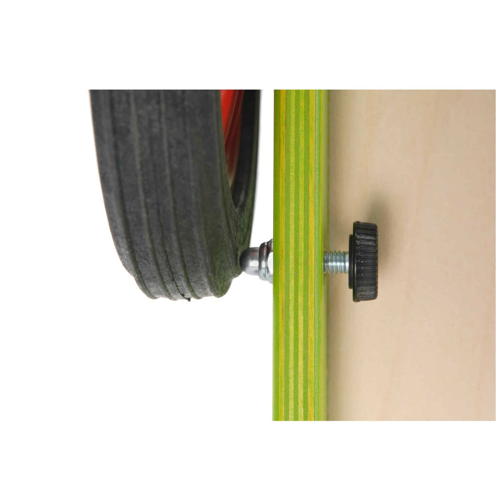 Einzigartig ist die eingebaute Bremsfunktion. Die Einstellung der Bremse kann an der Unterseite des Schiebemobils vorgenommen werden. Dadurch ist es möglich, dass auch kleinere Kinder mit dem Schiebemobil gefahrlos umgehen können.
