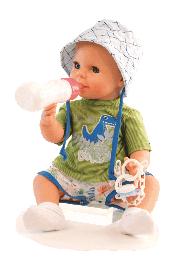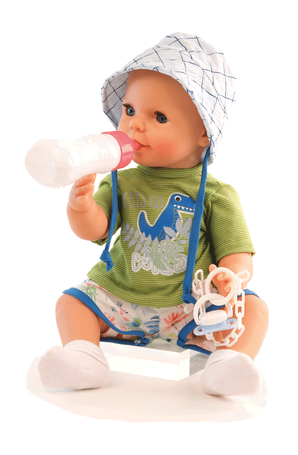 Die Puppe ist aus Vollvinyl gefertigt, mit beweglichen Armen und Beinen, sodass Finn in die richtigen Posen gebracht werden kann. Die aufgemalten Haare und seine hochwertige Kleidung machen die Puppe zu einem optischen Highlight, während der Schnuller und das Fläschchen die Möglichkeit bieten, Finn liebevoll zu umsorgen. Mithilfe der Windel, die bereits im Lieferumfang enthalten ist, können die Kinder Finn problemlos wickeln.