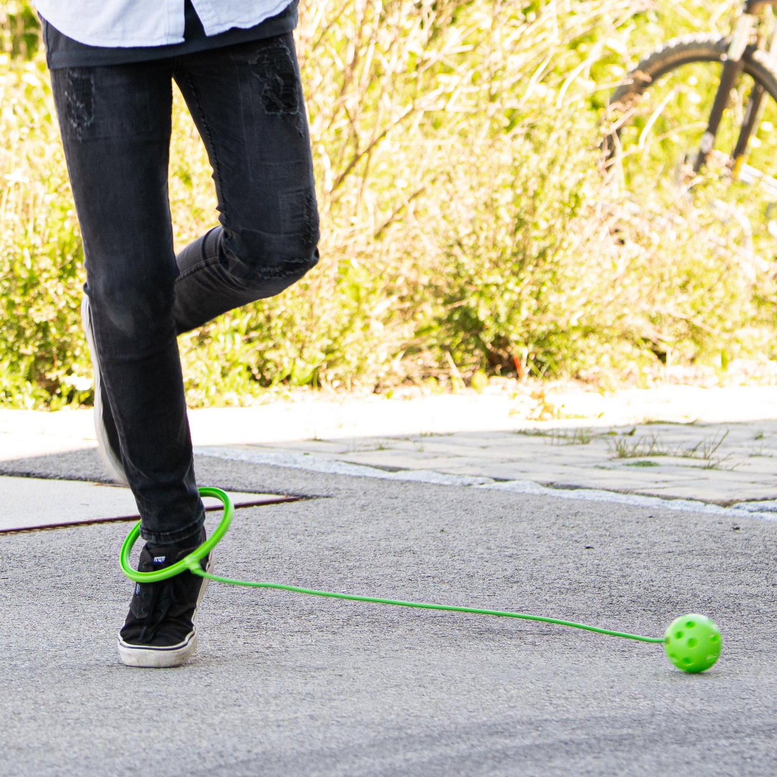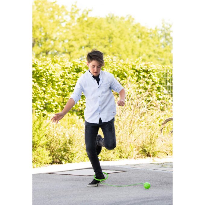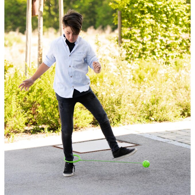 Der Schleuderball ist nicht nur ein typisches Pausenspiel, sondern auch eine großartige Möglichkeit, die Motorik, Koordination und Konzentration der Kinder spielerisch zu fördern. Um zu spielen, legen die Kinder den stabilen Kunststoff-Ring einfach um ihren Fußknöchel. Mit geschickten kreisenden Bewegungen nehmen sie den Ball am Seil in Schwung und können ihn dann mit voller Energie in die Höhe schleudern!