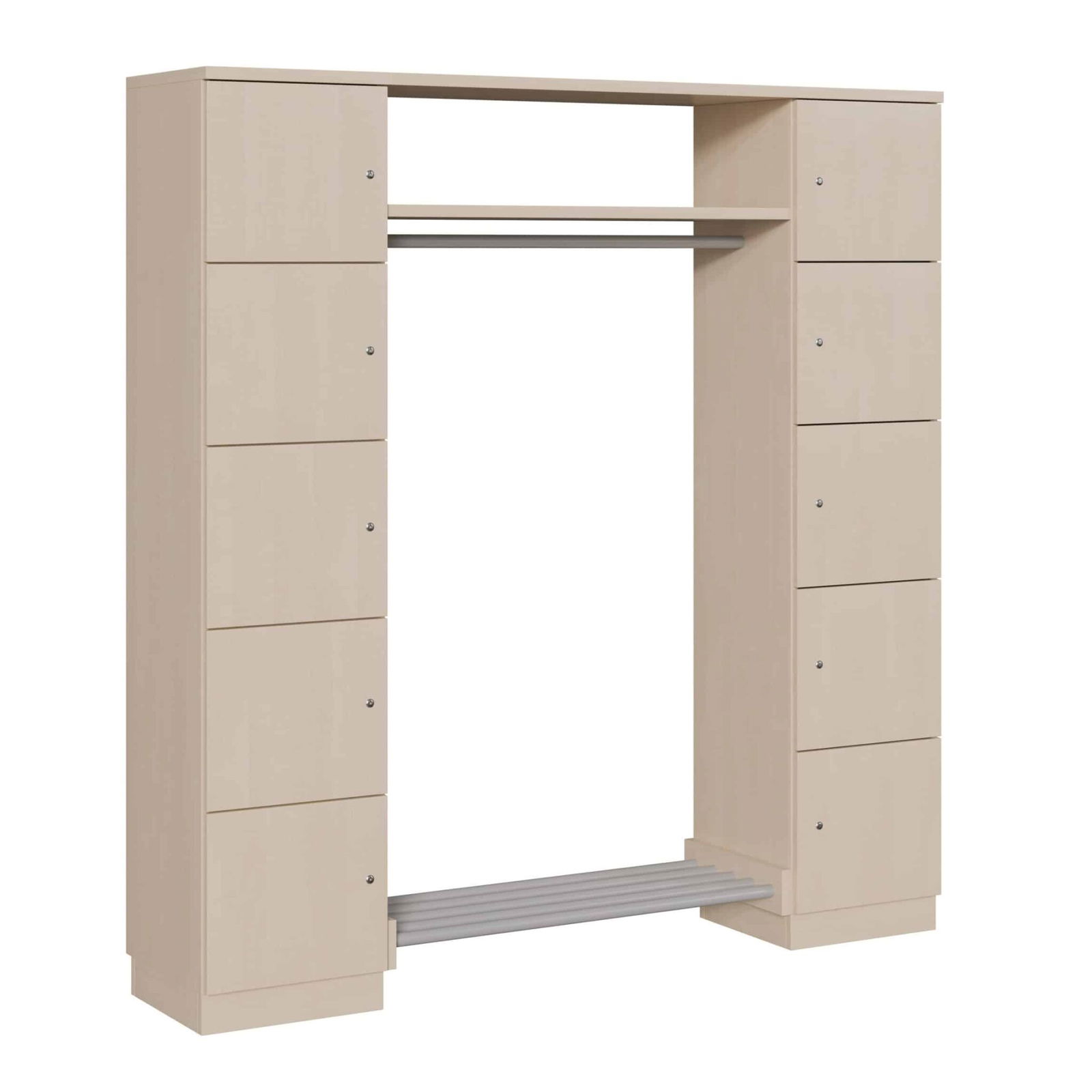 - Klare Trennung von Persönlichem und Allgemeinem: Die seitliche Anordnung der Schließfächer trennt den privaten Stauraum klar vom offenen Garderobenbereich. Das schafft eine intuitive Struktur und sorgt dafür, dass jeder Gegenstand seinen designierten Platz findet.
