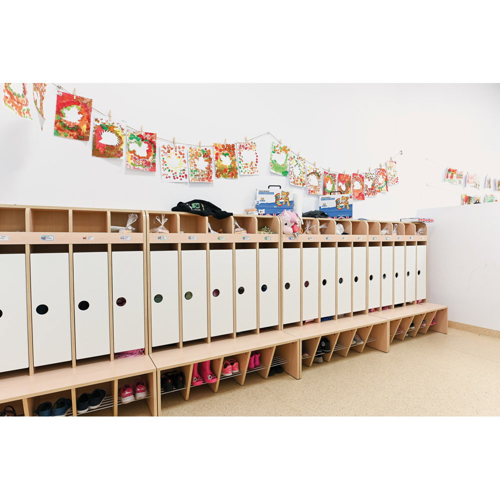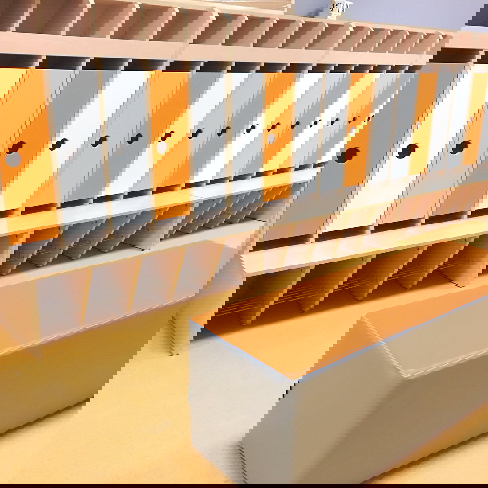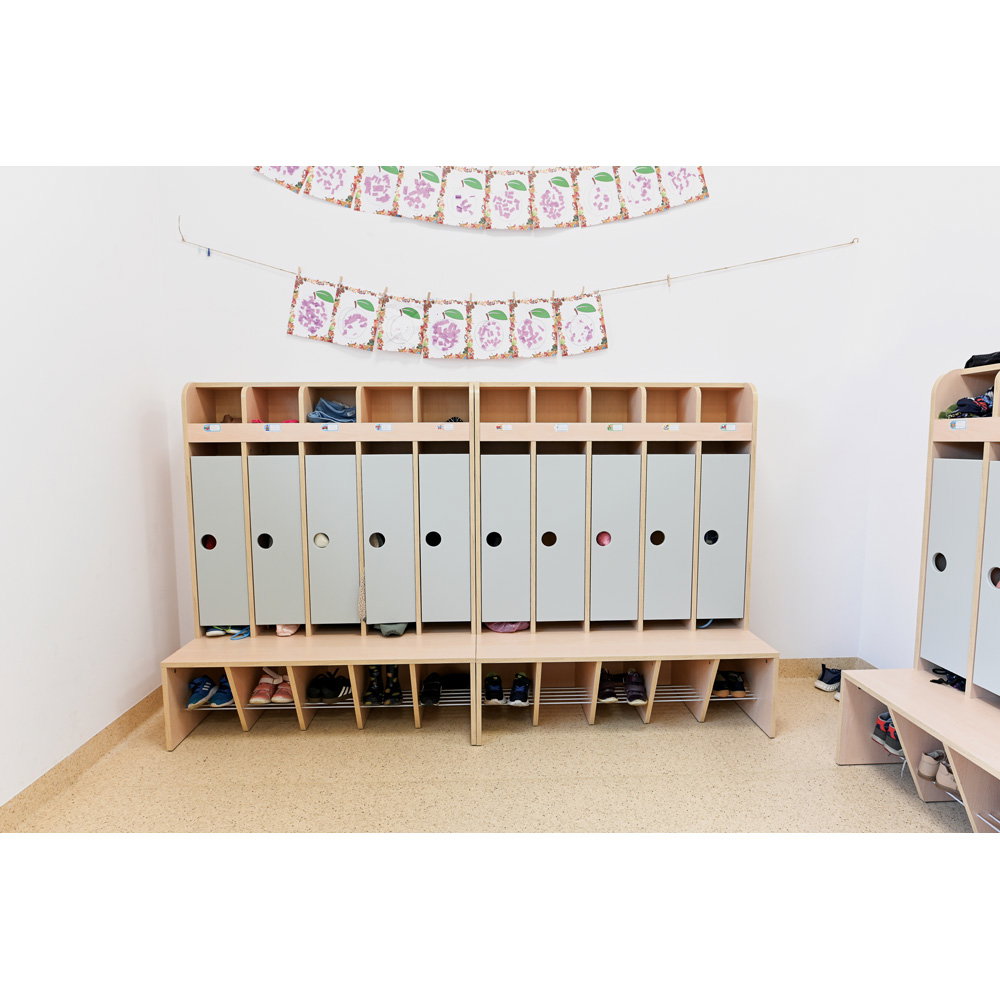 Durch die Veredelung mit einer robusten Folie erhalten die Türen eine besonders glatte, widerstandsfähige und optisch ansprechende Oberfläche. Sie bieten den Kindern einen geschützten Raum für ihre persönlichen Dinge und ermöglichen es Ihnen, das Erscheinungsbild Ihrer Garderobenanlage individuell zu gestalten. Schaffen Sie eine Atmosphäre, in der sich Funktionalität und hochwertiges Design die Hand geben und der Tag für jedes Kind in einer schönen Umgebung beginnt.