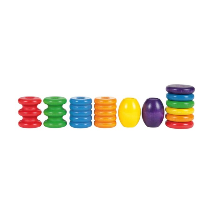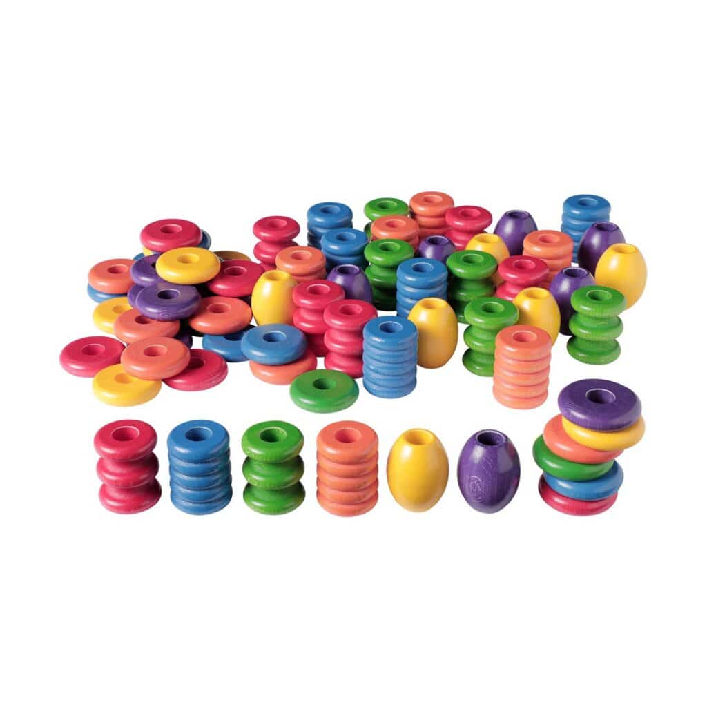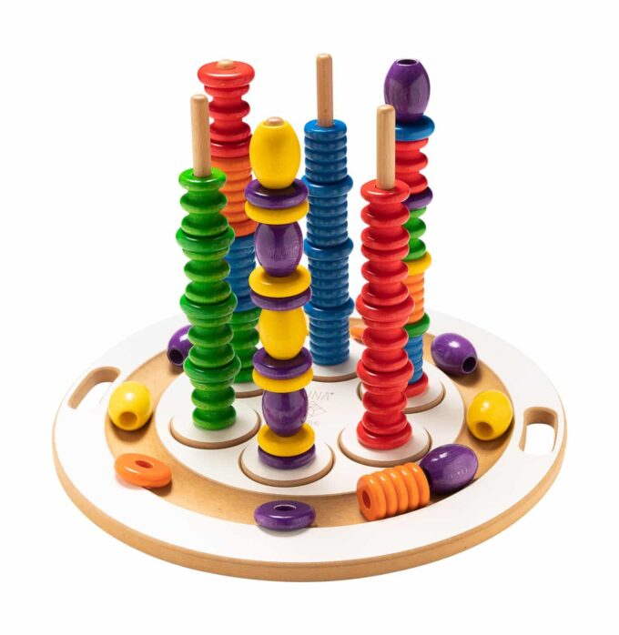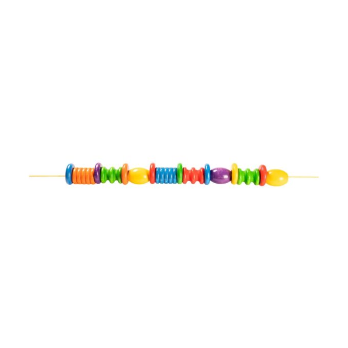 - Kinder trainieren ihre Hand-Auge-Koordination durch präzises Einfädeln und Stapeln der Schmuckperlen und -scheiben.