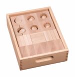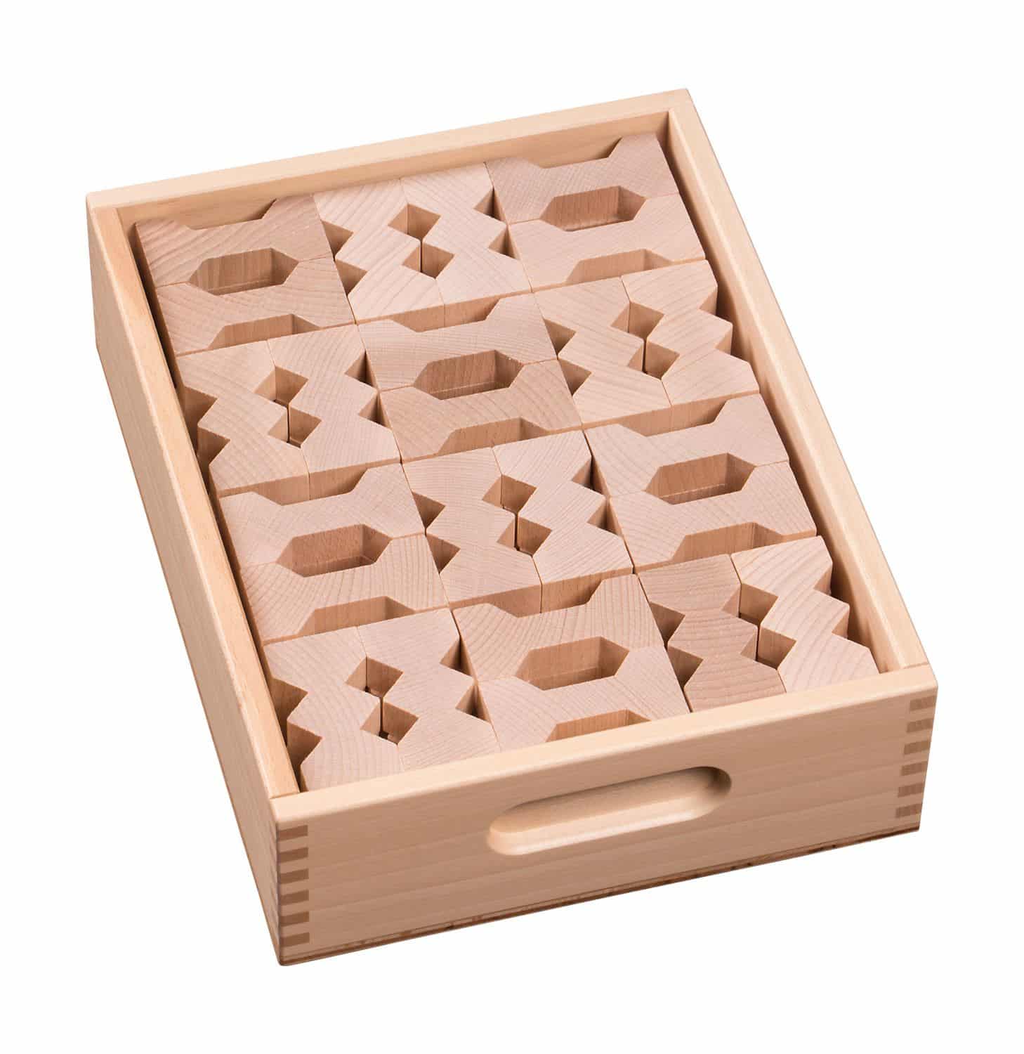 - Inhalt: 48 Zackensteine, 48 Trapezsteine, 1 Holzkasten (30 x 23 x 8,5 cm)