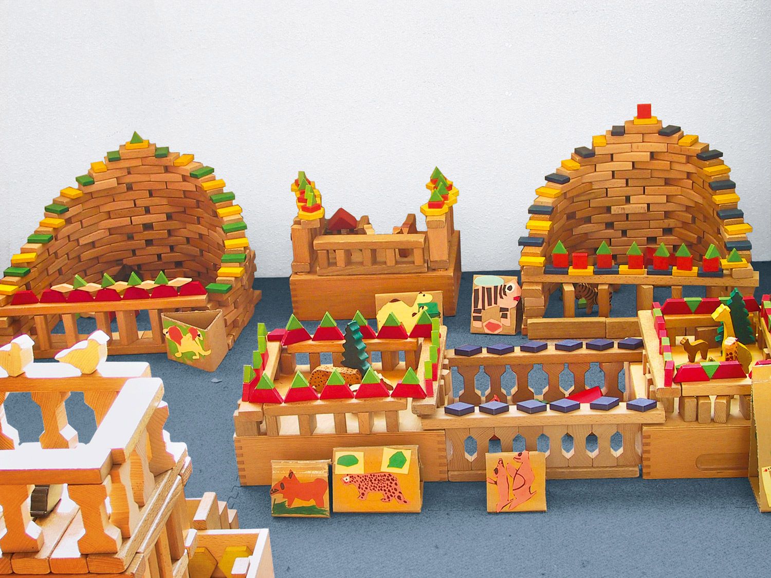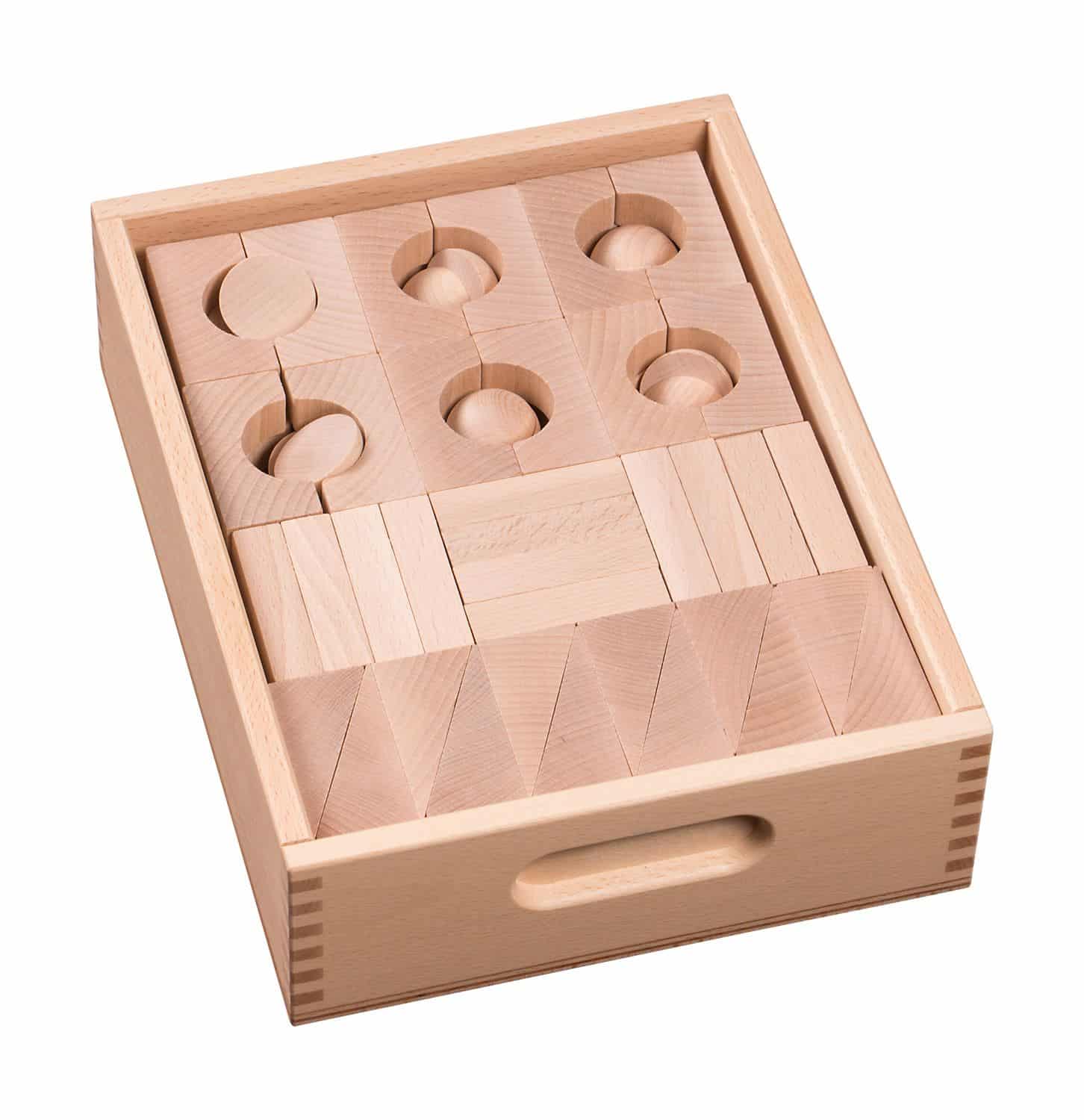 - Inhalt: 48 Säulensteine, 48 diagonalgeteilte Ziegel, 6 Kugeln, 12 Halbkugeln, 1 Holzkasten (30 x 23 x 8,5 cm)