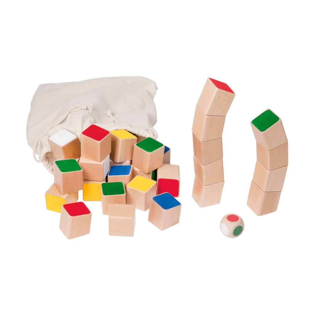 - Inhalt: 40 Stapelsteine (8 Würfel, 8 Trapeze, 8 Parallelogramme, 8 Würfel mit Schräge, 8 windschiefe Würfel), 1 Farbwürfel, 1 Baumwollbeutel, einschließlich 1 Spielanleitung