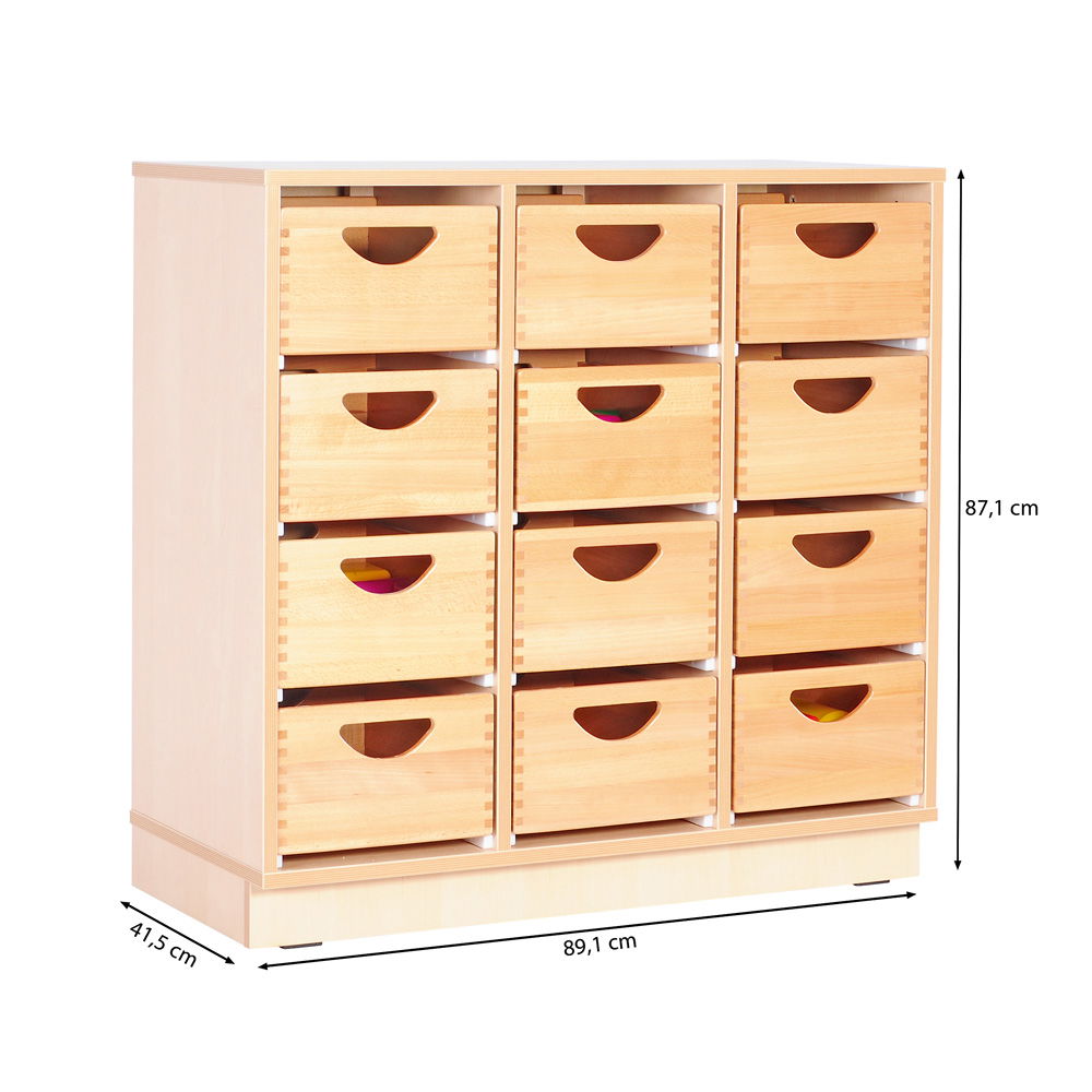 Der Schrank im freundlichen Birke-Dekor steht auf einem festen Sockel, der ihm eine hohe Stabilität verleiht und eine ruhige, bodenbündige Optik schafft. Im Inneren sorgen die beiden vertikalen Trennwände für eine klare Gliederung in drei separate Spalten. In diesen werden die zwölf hohen Holzbehälter auf leichtgängigen Führungsschienen platziert. Dieses Schubladensystem ermöglicht einen komfortablen und vollständigen Zugriff auf den Inhalt jeder einzelnen Box, ohne dass diese herausgenommen werden muss. Das natürliche Buchenholz der Behälter harmoniert wunderbar mit dem hellen Korpus und schafft eine warme, einladende Atmosphäre, die zum Ordnung halten motiviert.