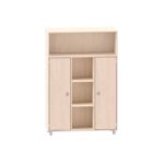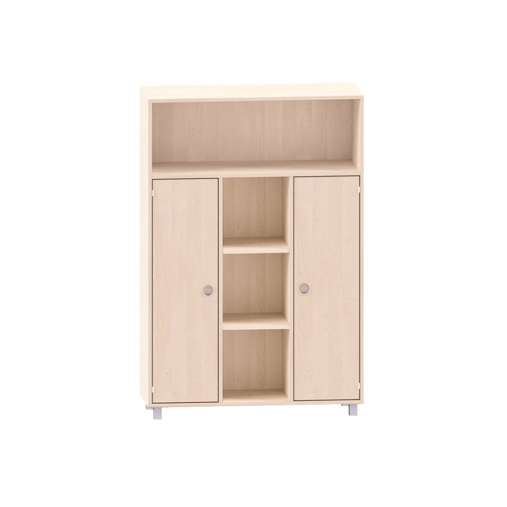 Schrank mit 3 Böden, oben beide offen und unten Fächer mit Türen für Kitas & Schulen
