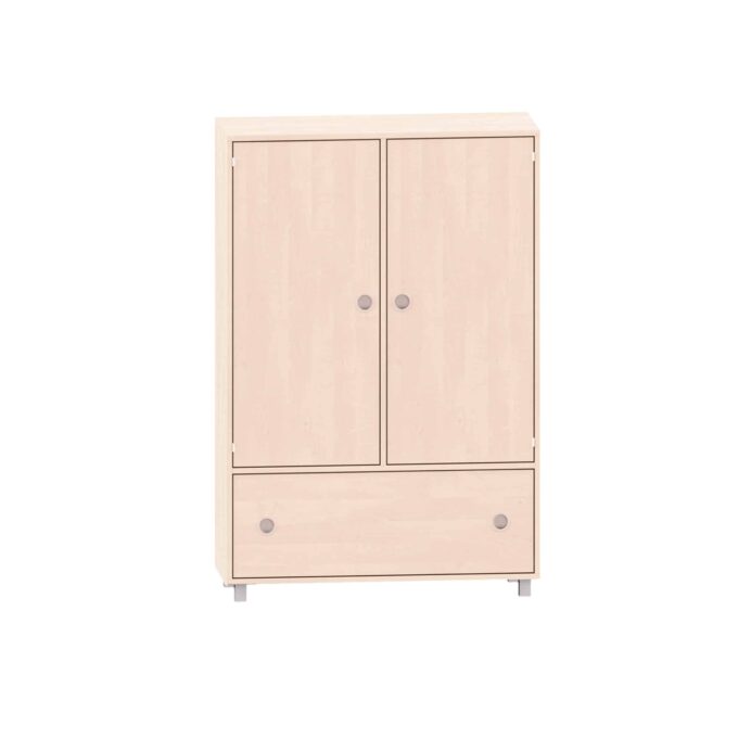 Schrank mit 3 Böden, oben freies Fach, mittig 2 Türen und unten ein Schubkasten für Kitas & Schulen
