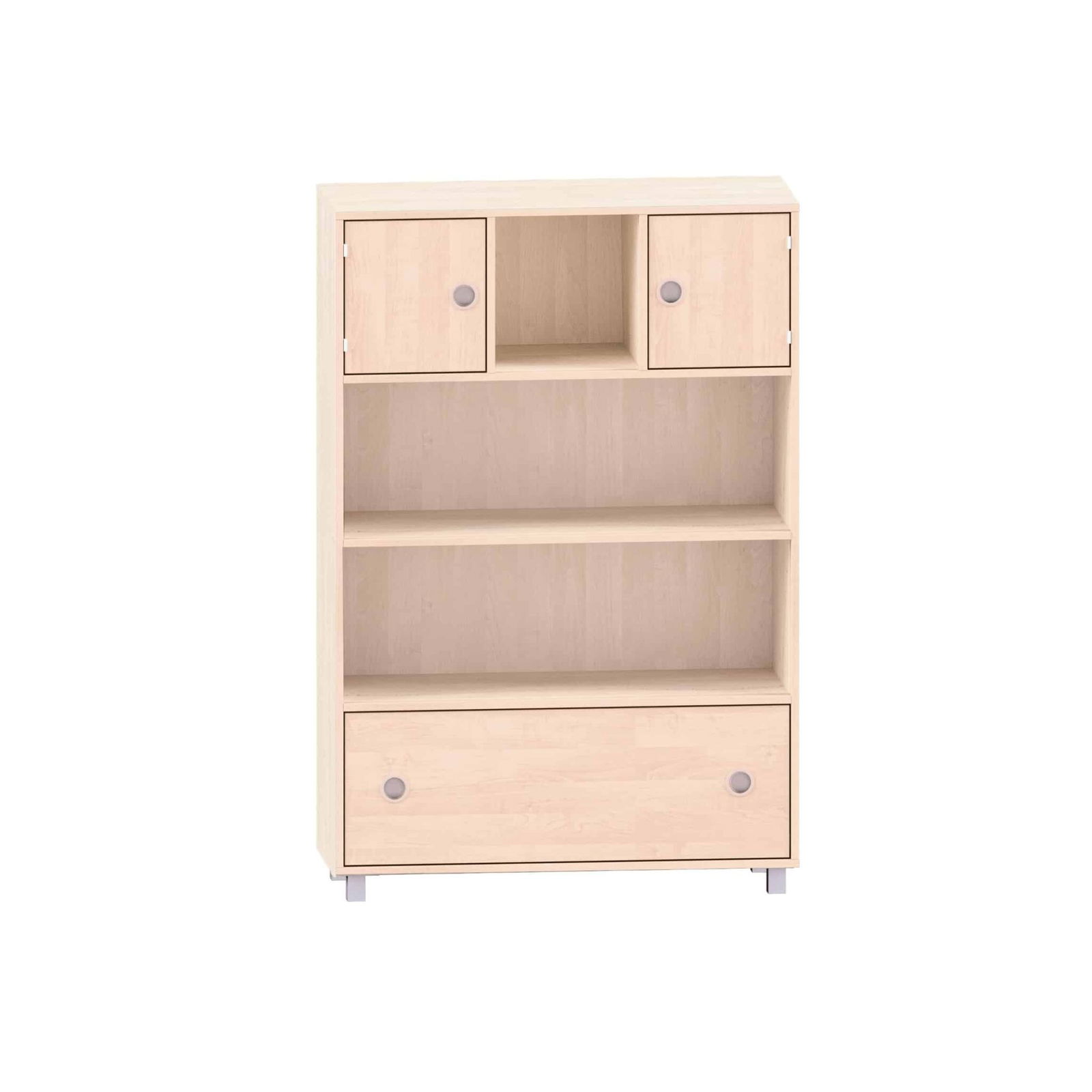 Schrank mit 3 Böden, oben links und rechts je eine Tür, mittig freie Fächer und unten ein Schubkasten für Kitas & Schulen