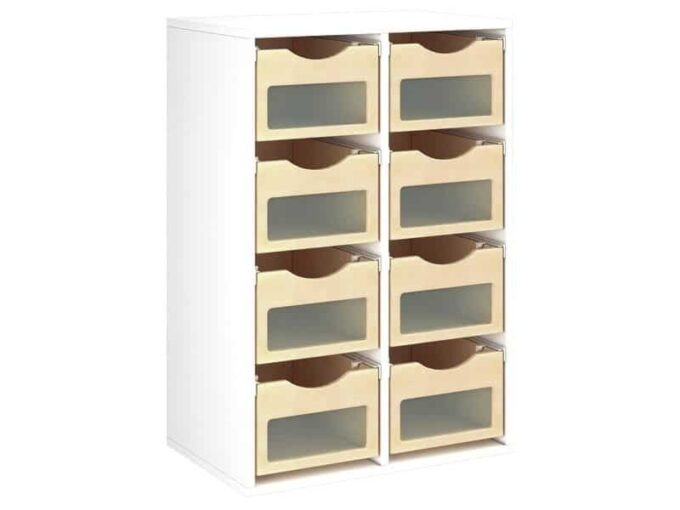 - Benutzerfreundlichkeit: Der Schrank verfügt über 8 Holzbehälter auf Schienen und ein integriertes Stoppsystem mit Fallschutz, das eine einfache Handhabung ermöglicht. Die Behälter sind äußerst widerstandsfähig und sorgen für eine lange Lebensdauer.