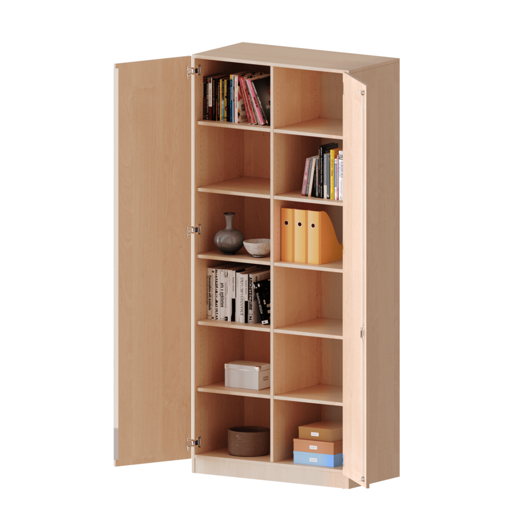 • Platzsparende 270°-Türen: Die robusten Türen sind mit speziellen Scharnieren ausgestattet, die eine Öffnung um 270° ermöglichen. Sie lassen sich komplett an die Seitenwände des Schranks anlegen und stehen so auch in geöffnetem Zustand niemals im Weg – perfekt für belebte Umgebungen und schmale Durchgänge.