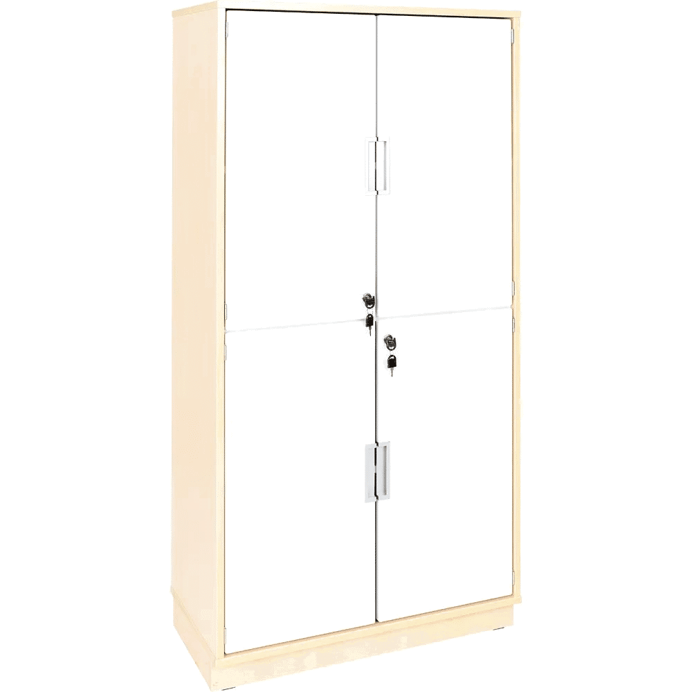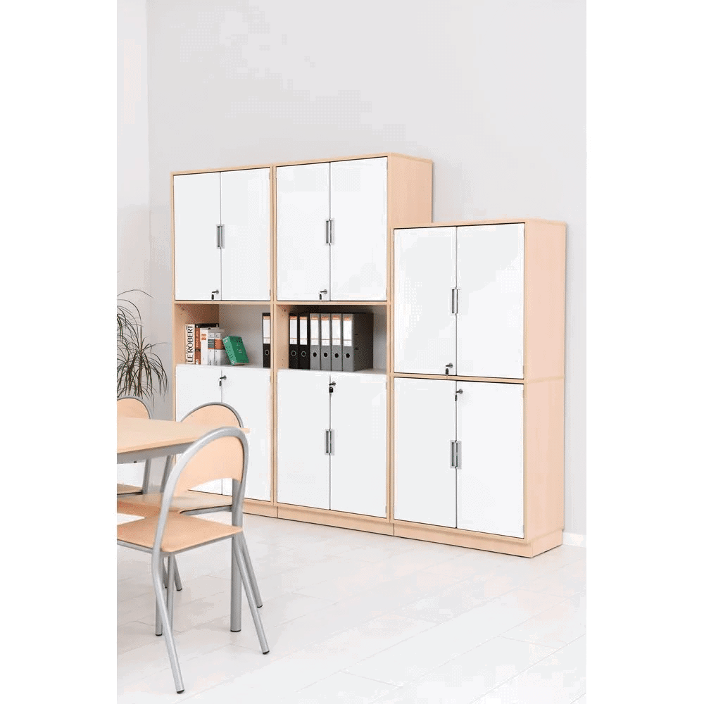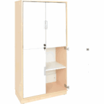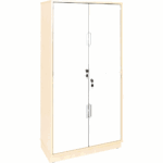 Die schlichten, weißen Türen sind abschließbar und mit alufarbenen Muschelgriffen ausgestattet, die dem Schrank eine zeitgemäße Note verleihen.