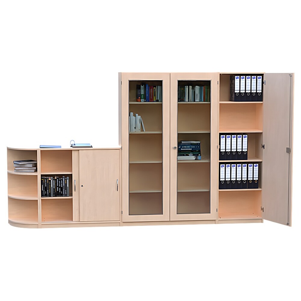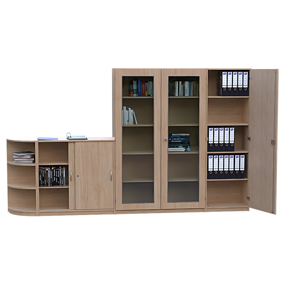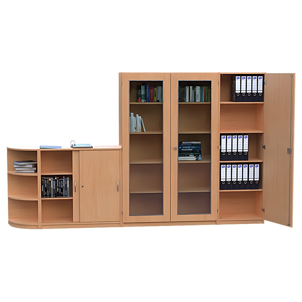 Ein echtes optisches Highlight dieser Konstruktion ist der 120 Zentimeter breite Hochschrank. Ausgestattet mit zwei abschließbaren Türen, die über großzügige 3/3-Glasausschnitte verfügen, wirkt dieses Modul besonders leicht und einladend. Hier präsentieren Sie repräsentative Gegenstände oder wichtige Fachliteratur staubgeschützt und dennoch sichtbar. Eine stabile Mittelwand und insgesamt acht Einlegeböden sorgen für eine perfekte, kleinteilige Organisation. Direkt daneben bietet ein weiterer, 60 Zentimeter breiter Hochschrank mit einer blickdichten, abschließbaren Tür (Türanschlag rechts) und vier verstellbaren Einlegeböden den idealen Ort für vertrauliche Dokumente. Beide hohen Elemente messen 190 Zentimeter in der Höhe und nutzen den vertikalen Raum Ihres Büros optimal aus.