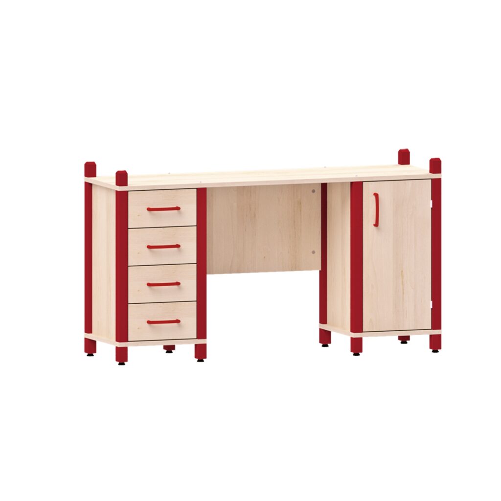 Investieren Sie in einen Schreibtisch, der den täglichen Herausforderungen in einer Kita gewachsen ist und durchdachten Stauraum zur Optimierung Ihres Arbeitsalltages liefert. Unser Schreibtisch mit 4 Schubladen und 1 Tür ist die perfekte Wahl für eine organisierte, produktive Kita, in der Ordnung und Pädagogik im Einklang stehen.