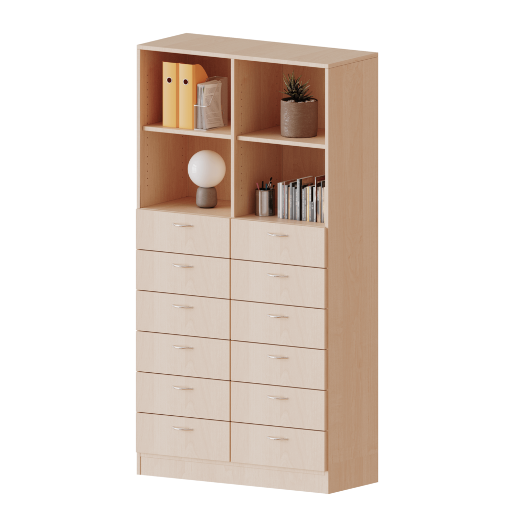 • Aufbau: 12 Schubladen unten, 4 offene Regalfächer oben