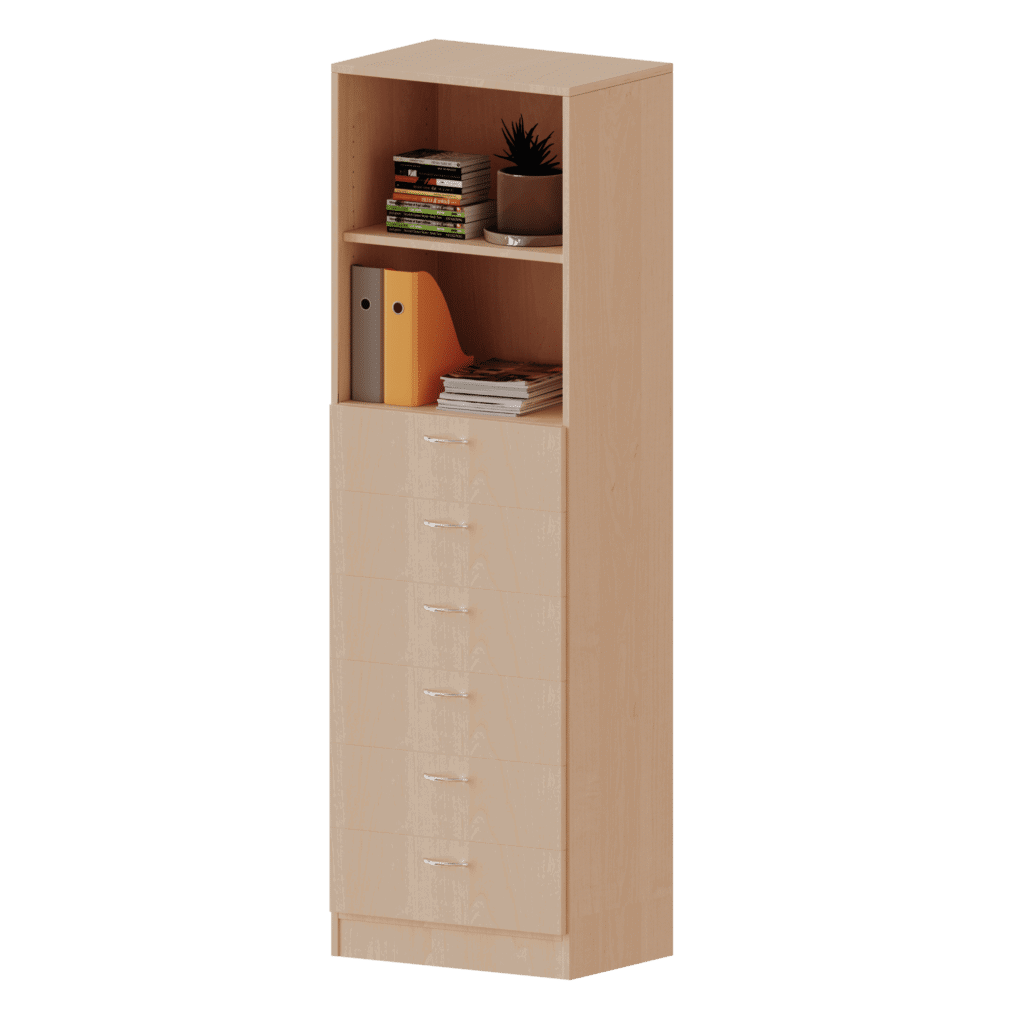 - Aufbau: 6 Schubladen unten, 2 offene Regalfächer oben