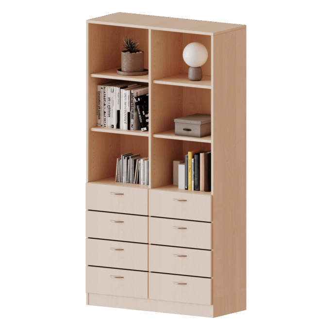 Der breite Schubladen-Kombischrank der Serie evo180 ist die perfekte Lösung für alle, die eine ausgewogene Mischung aus schnellem Zugriff und diskretem Stauraum benötigen. Mit einer Höhe von 190 cm und einer großzügigen Breite bietet dieses Möbelstück eine ideale Aufteilung für dynamische Arbeits- und Lernumgebungen. Im oberen Bereich schaffen sechs offene Fächer reichlich Platz für Ordner, Bücher und Materialien, die stets griffbereit sein müssen. Darunter bieten acht geräumige Schubladen strukturierten, blickdichten Stauraum für Dokumente, Kleinteile und persönliche Gegenstände. Dank einer stabilen Mittelwand und der hochwertigen Sichtrückwand ist dieser Kombischrank nicht nur ein leistungsstarkes Stauraumwunder, sondern auch ein eleganter und robuster Raumteiler.
