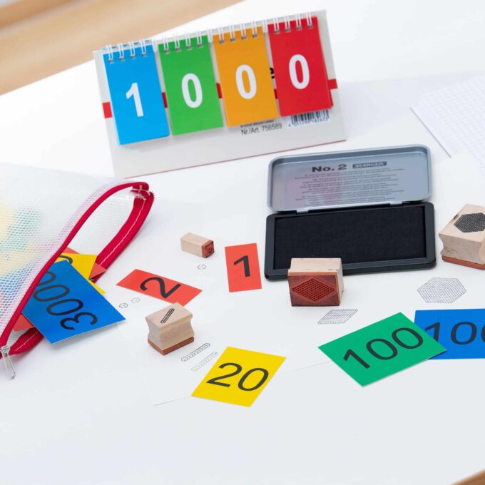 - Zehnerbasis-Stempel: Diese Stempel sind ideal, um Zahlen in der Horizontalebene zu visualisieren. Durch die Nutzung der Stempel entfällt das aufwendige Zeichnen, was eine hohe Zeitersparnis bedeutet und die Orientierung im dekadischen System erheblich verbessert. Die Stempel sind bereits mit wasserfester Tinte befüllt und für DIN A5- sowie DIN A4-Hefte geeignet.
