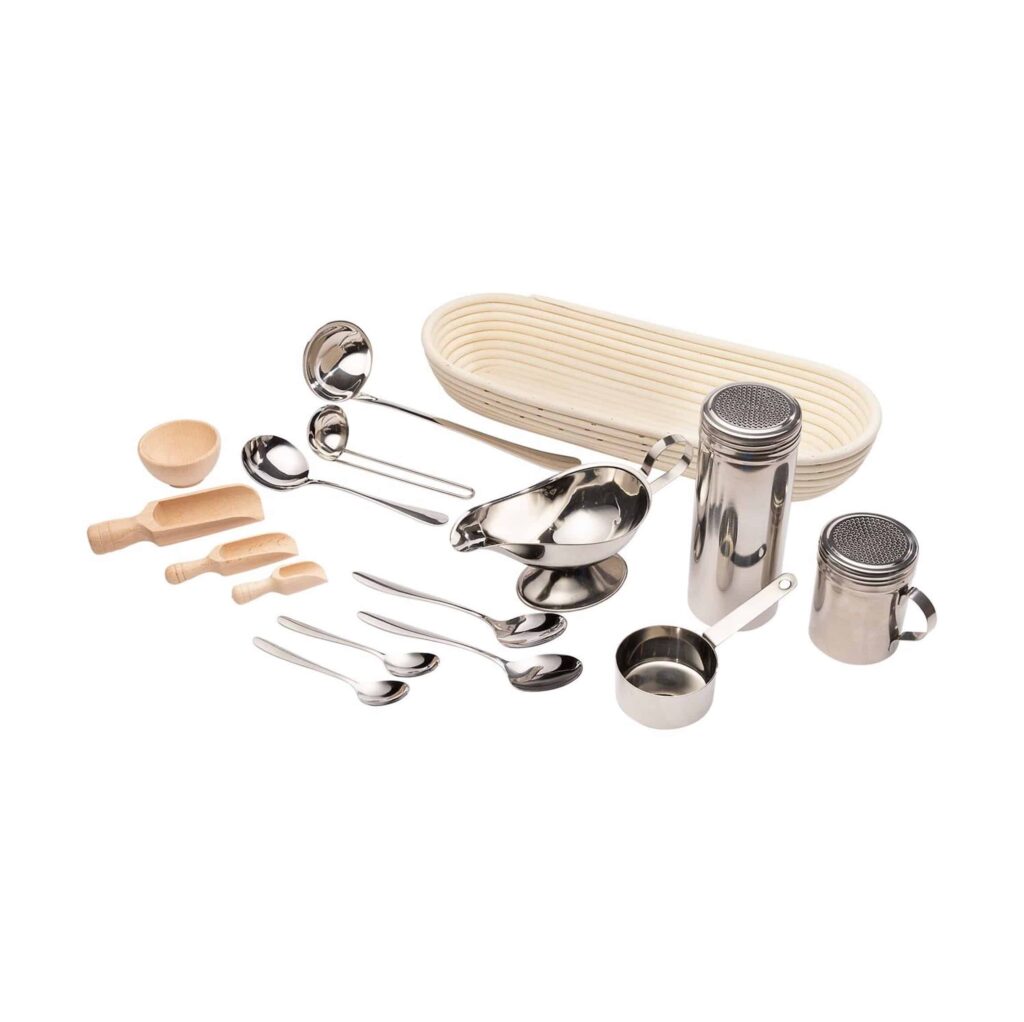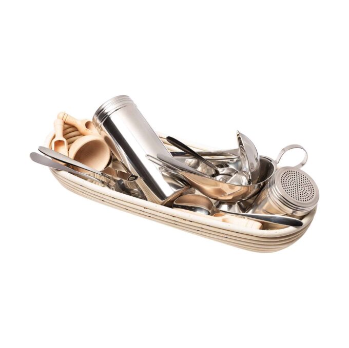 Mit den enthaltenen 2 Streuern, 1 Sauciere, 5 Löffeln in verschiedenen Größen, 3 Schöpfern und 3 Schäufelchen können die Kinder ihrer Fantasie freien Lauf lassen und unterschiedliche Aktivitäten im Sand oder anderen Materialien ausprobieren. Das Schüsselchen und der Aufbewahrungskorb sorgen zudem für eine praktische und ordentliche Aufbewahrung der Utensilien, sodass alles jederzeit griffbereit ist.