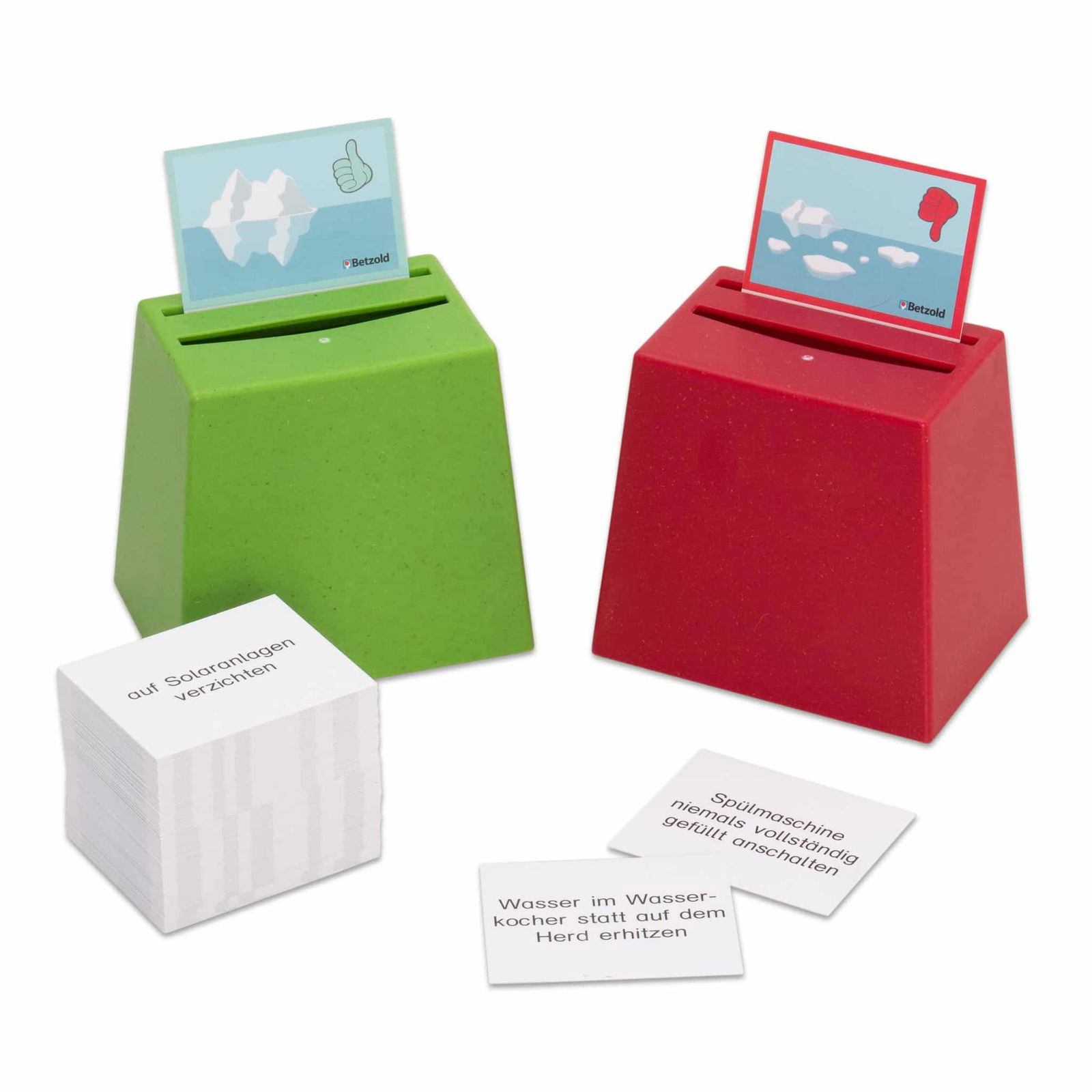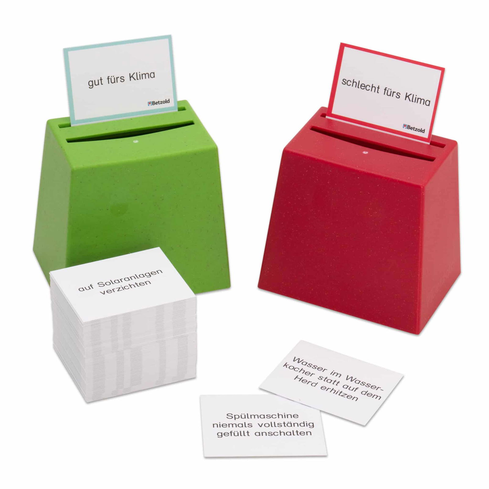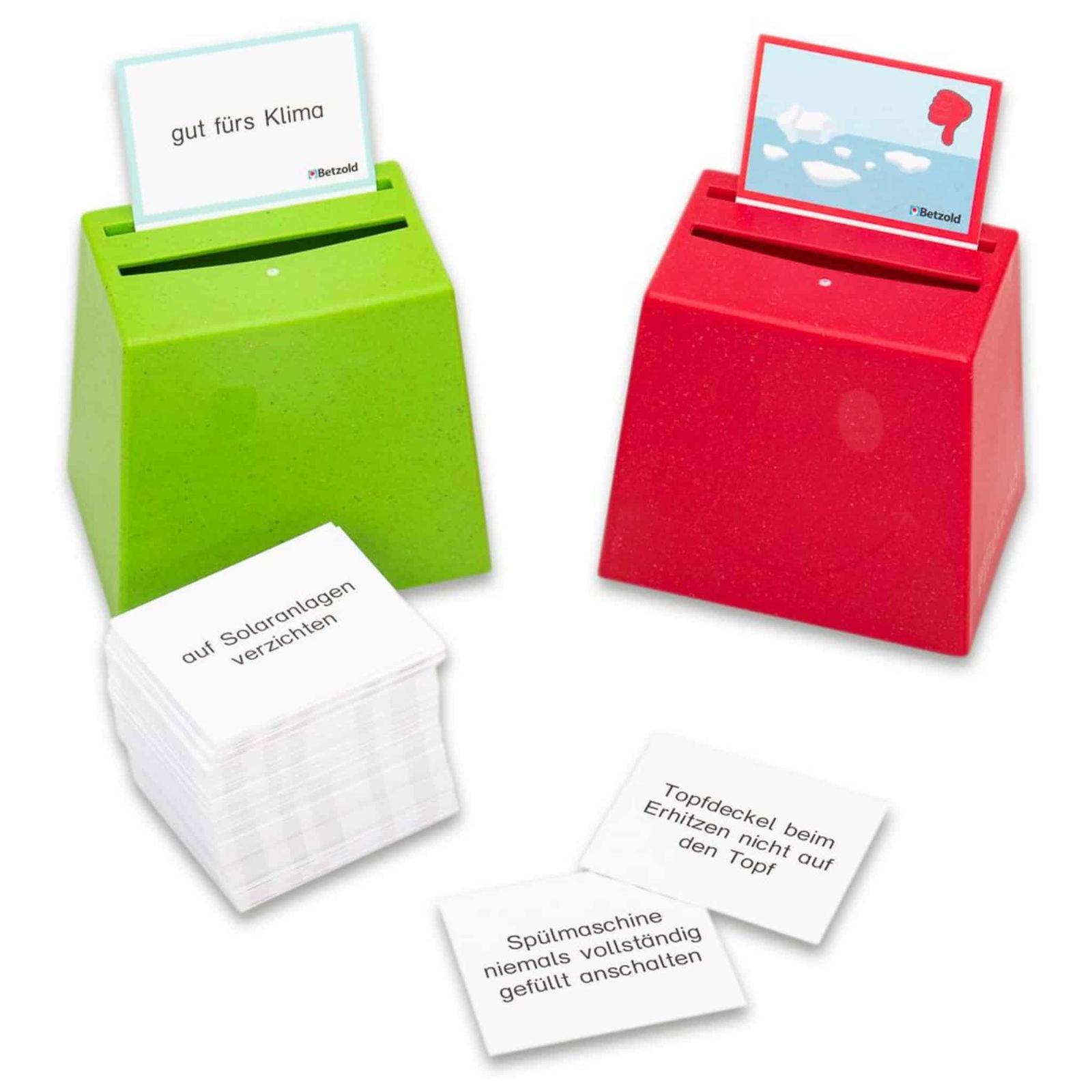 Für die Durchführung des Spiels benötigen Sie 2 Becherquizzer (nicht im Lieferumfang enthalten). Stellen Sie diese mit der offenen Seite nach unten auf den Tisch. Stecken Sie die beiden Aufgabenkarten in den hinteren Schlitz auf der Oberseite jedes Bechers. Die Spieler entscheiden dann, ob sie die Karten mit Symbolen oder den Text „gut fürs Klima“ / „schlecht fürs Klima“ verwenden möchten.