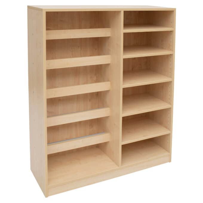 - Extrem robust und für den Dauereinsatz gebaut: Das gesamte Regal besteht aus hochwertigen, melaminharzbeschichteten Spanplatten. Dieses Material wurde für die hohen Anforderungen in Bildungseinrichtungen ausgewählt und ist außerordentlich kratz-, stoß- und abriebfest. Es hält dem täglichen Ansturm von Kindern problemlos stand und garantiert eine lange Lebensdauer ohne Qualitätsverlust.