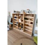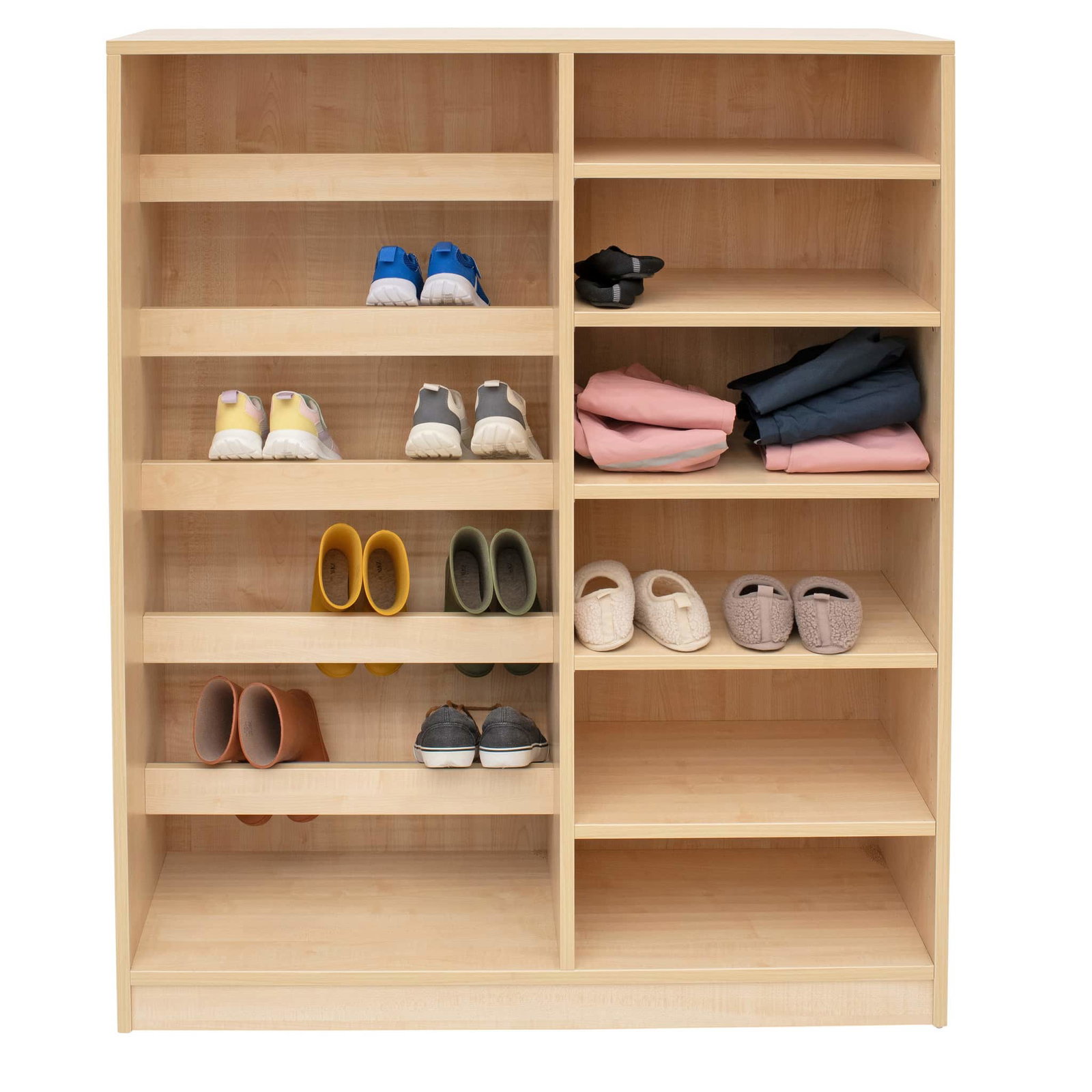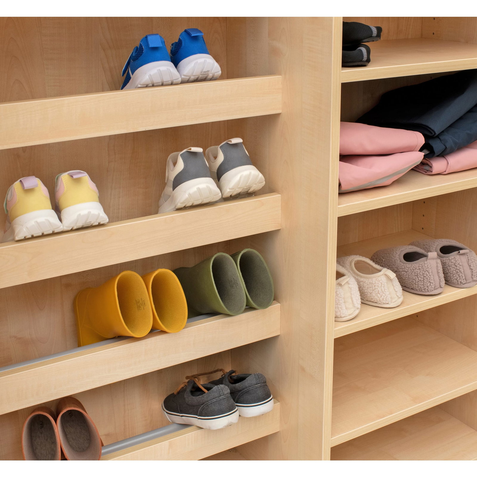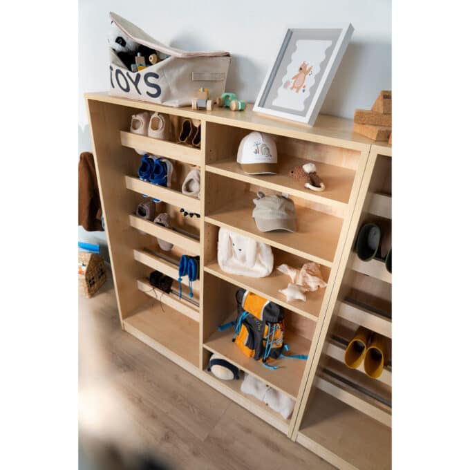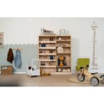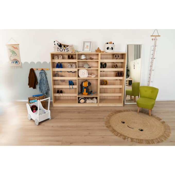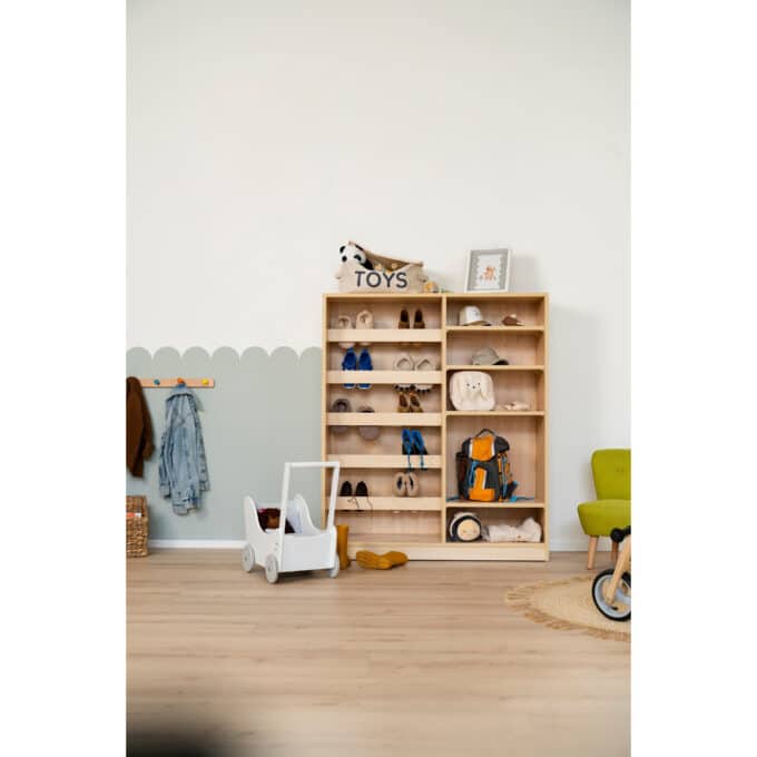 - Großzügiger Stauraum für den gesamten Bedarf: Mit einer Breite von über einem Meter bietet dieses Regal enorm viel Platz. Es bringt nicht nur eine große Menge an Schuhen unter, sondern dient auch als zentrale Ablage für alles, was Kinder beim Ankommen und Gehen benötigen. Das schafft eine klare Struktur, fördert die Selbstständigkeit der Kinder und sorgt für einen aufgeräumten, einladenden Eingangsbereich.