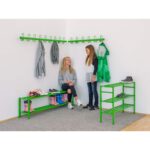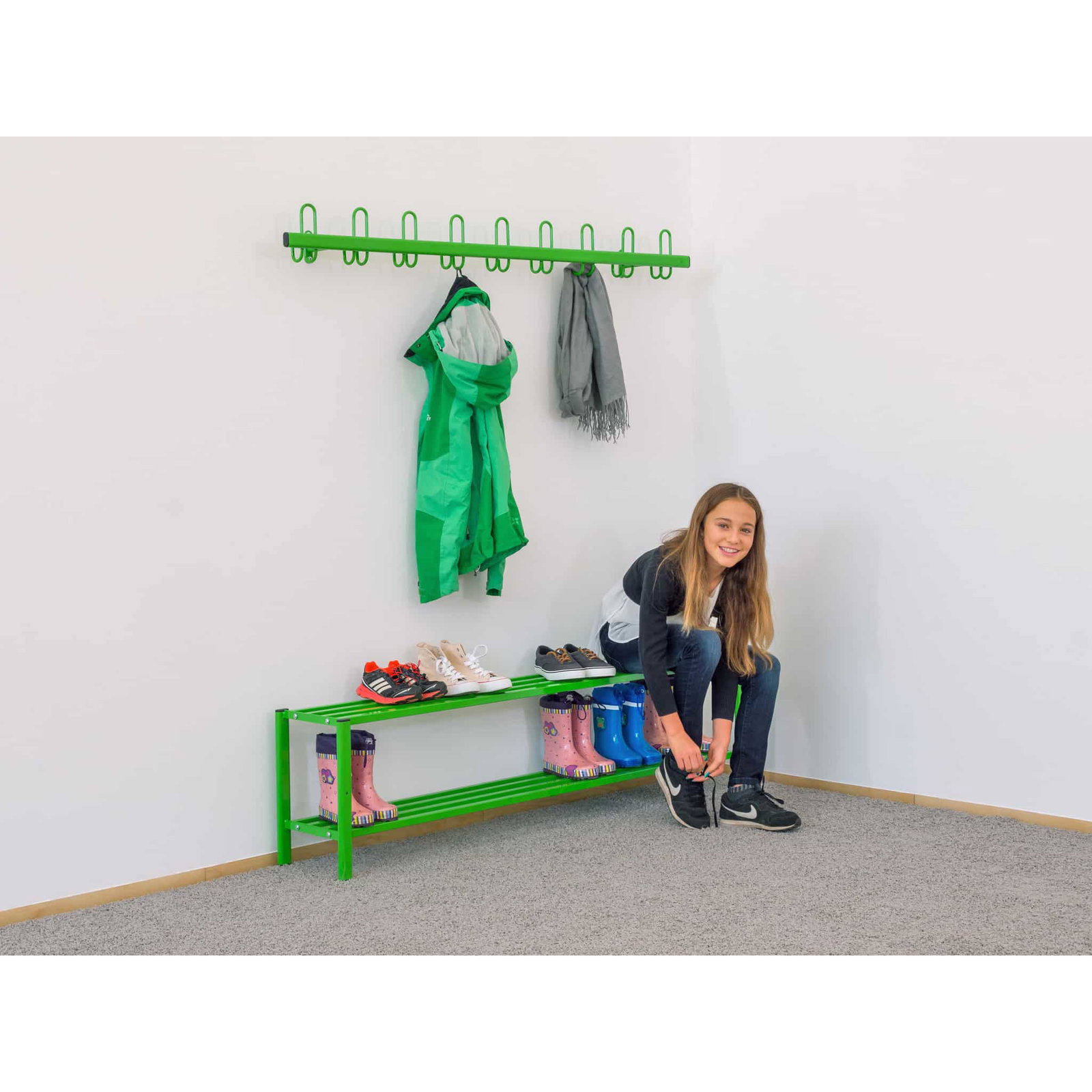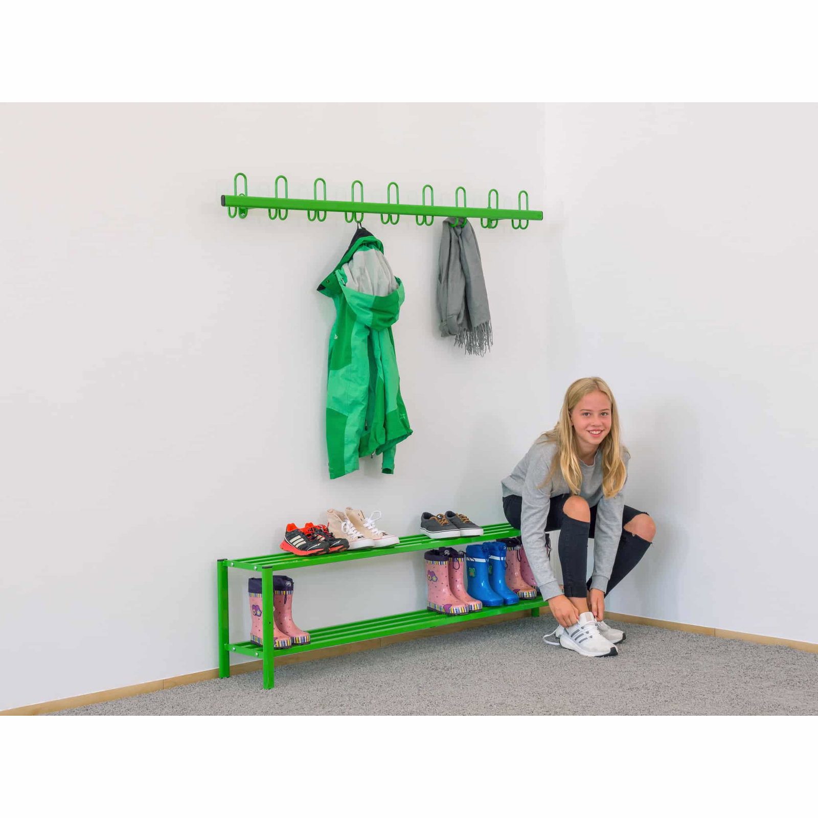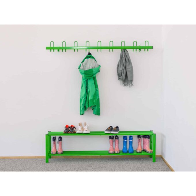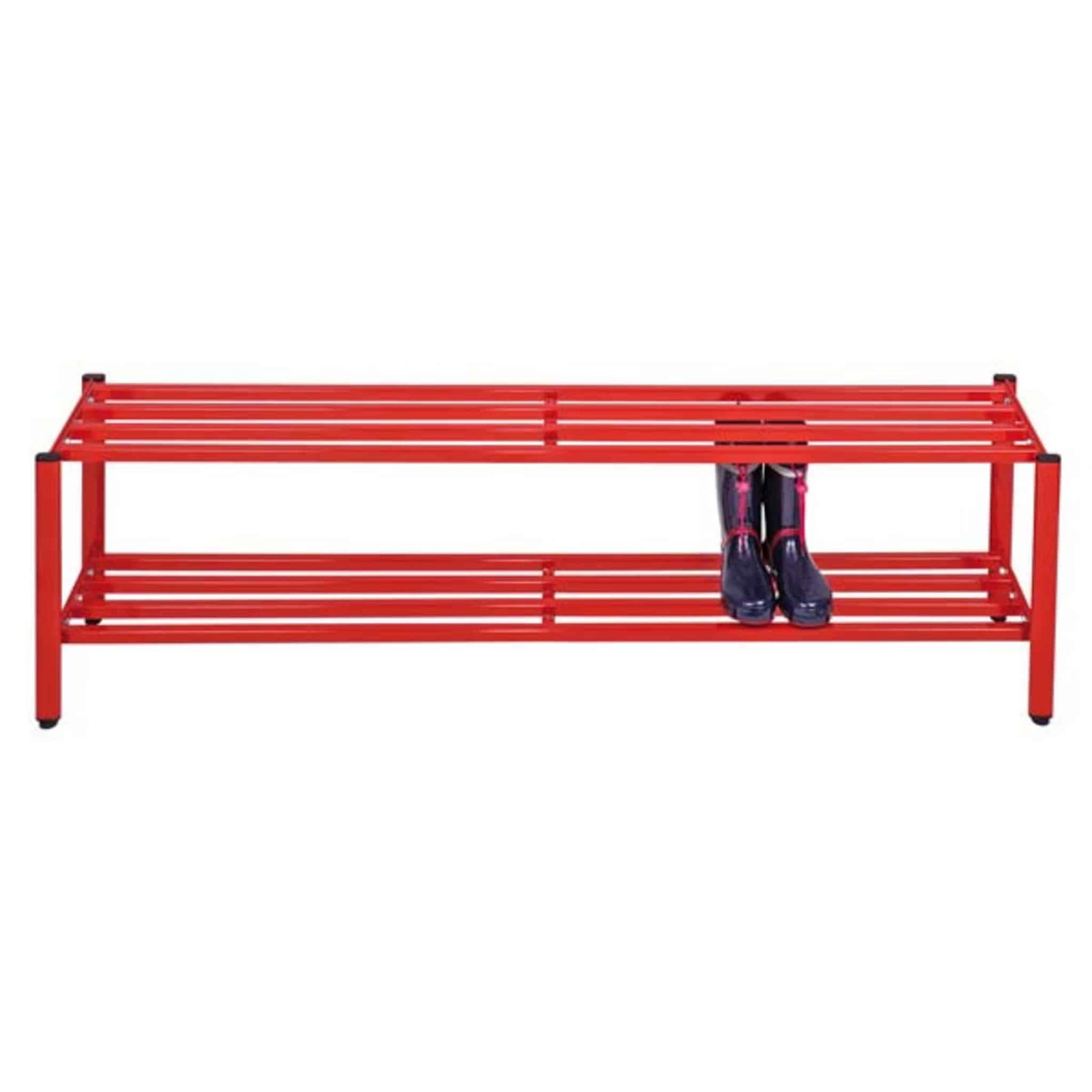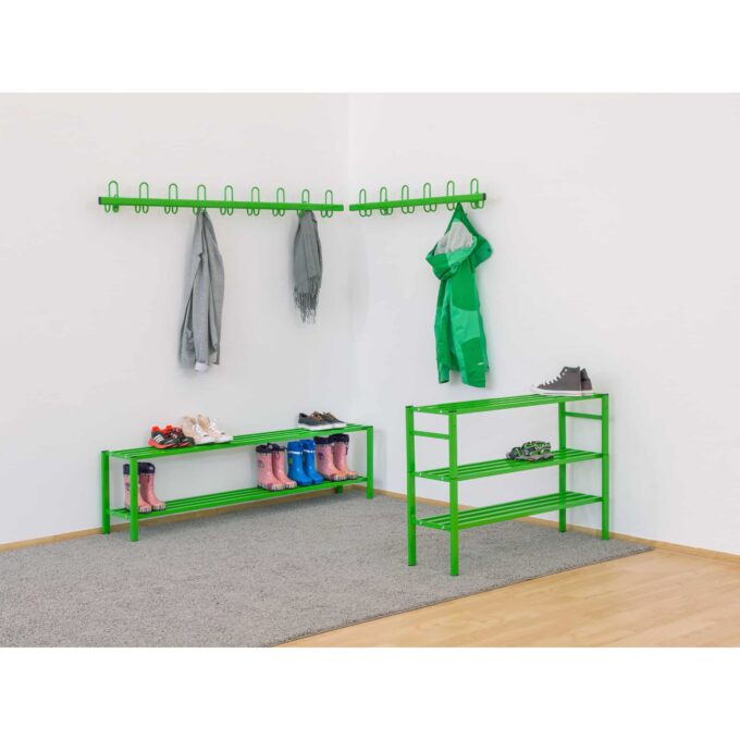 Das Grundregal für Stiefel bietet eine durchdachte Möglichkeit, Ordnung in Garderobenräumen, Klassenzimmern und Kindergärten zu schaffen. Dieses robuste und stabile Regal wurde speziell konzipiert, um nasse Gummi- oder Winterstiefel sicher aufzubewahren und dabei den Raum optimal zu nutzen. Hergestellt aus hochwertigem pulverbeschichtetem Stahl, überzeugt es durch Langlebigkeit, hohe Belastbarkeit und ein ästhetisches Design in modernem Rot. Dank der großzügigen Ablagefläche und der Möglichkeit, das Grundregal mit passenden Aufsatzregalen zu kombinieren, ist es ideal für Einrichtungen, die zusätzliche Schuhaufbewahrung benötigen. Zudem dient die obere Fläche als praktische Sitzbank, wodurch sich das Regal besonders gut für den Einsatz in Umkleideräumen, Eingangsbereichen oder Garderoben eignet.